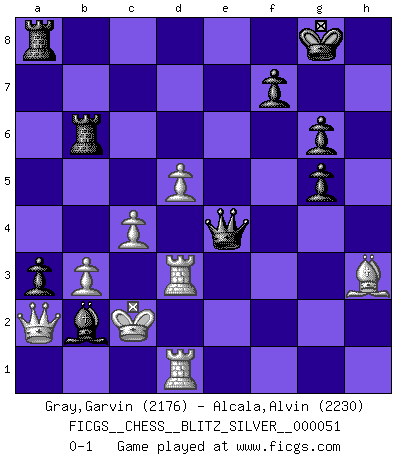 Last move : 0-1 2011 June 19 15:28:17 [Event "FICGS__CHESS__BLITZ_SILVER__000051"] [Site "FICGS"] [Date "2011.06.19"] [Round "1"] [White "Gray,Garvin"] [Black "Alcala,Alvin"] [Result "0-1"] [WhiteElo "2176"] [BlackElo "2230"] 1.e4 c5 2.Nf3 d6 3.d4 cxd4 4.Nxd4 Nf6 5.Nc3 a6 6.Bg5 e6 7.Qf3 Bd7 8.O-O-O Nc6 9.Kb1 Rc8 10.Be2 h6 11.Bc1 b5 12.a3 Nxd4 13.Rxd4 Qb6 14.Rhd1 e5 15.R4d3 Be7 16.Qe3 Qc7 17.f4 O-O 18.Qd2 Rfd8 19.Rg3 Bc6 20.Bg4 Rb8 21.Qe2 a5 22.Nd5 Bxd5 23.exd5 b4 24.Bf5 bxa3 25.Rxa3 Qc5 26.Rad3 a4 27.fxe5 dxe5 28.Qxe5 a3 29.Be3 Qc4 30.b3 Bd6 31.Qa1 Qc7 32.Bf2 Ra8 33.Qa2 Bxh2 34.c4 g6 35.Bh3 Ne4 36.Bd4 Be5 37.Re3 Bxd4 38.Rxe4 Bg7 39.Re3 Rdb8 40.Kc2 Qf4 41.Rf3 Qe4+ 42.Rfd3 Bb2 43.g4 Rb6 44.g5 hxg5 0-1 Sicilian : Najdorf, 6...e6 Queenside Castling by player White (move 8) Kingside Castling by player Black (move 17) Player Black won this chess game. Follow this game move after move (download)Chess, like love, like music, has the power to make people happy. (Siegbert Tarrasch) Konzentriere dich auf materielle Gewinne. Nimm, was dir dein Gegner gibt, ausser es gibt einen guten Grund der dagegenspricht. (Robert James Fischer) Yo adoro todas la posiciones. Denme una partida posicional difícil, y la jugaré. Pero posiciones totalmente ganadas, no las tolero. (Hein Donner) Karpov est une pièce de musée. (Garry Kasparov) War is the child of passion, passion is the child of narcissism and narcissism is the child. (...) Another game ? (Thibault de Vassal)