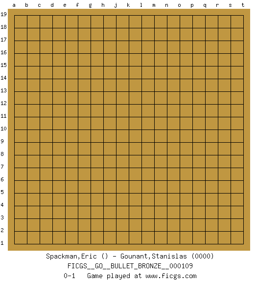 Last move : 0-1 2011 June 19 19:57:40 [Event "FICGS__GO__BULLET_BRONZE__000109"] [Site "FICGS"] [Date "2011.06.19"] [Round "1"] [Black "Spackman,Eric"] [White "Gounant,Stanislas"] [Result "0-1"] [Rating 2 "0000"] 0-1 This go game has been lost on time (started : 2011.06.19 14:28:44) Here are the names of the openings (joseki) played in the four corners : Player White won this Go (weiqi, baduk) game. Follow this game move after move (download)If you lose by one point, take a rest. (Anonymous) Perseverance does not equal worthiness. Next time you want to get my attention, wear something fun. Low-riding jeans are hot. (Gregory House, House M.D.)