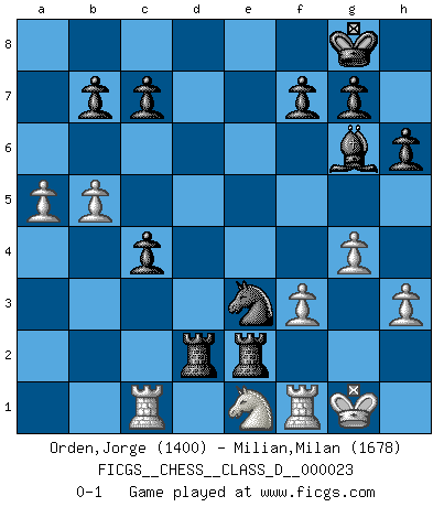 Last move : 0-1 2007 February 21 21:26:23 [Event "FICGS__CHESS__CLASS_D__000023"] [Site "FICGS"] [Date "2006.12.24"] [Round "1"] [White "Orden,Jorge"] [Black "Milian,Milan"] [Result "0-1"] [WhiteElo "1400"] [BlackElo "1678"] 1.e4 e5 2.Nf3 Nf6 3.Nc3 Bb4 4.d3 Nc6 5.Bd2 O-O 6.Be2 d6 7.O-O h6 8.a3 Bc5 9.b4 Bb6 10.Na4 Nd4 11.Nxb6 axb6 12.c3 Nxe2+ 13.Qxe2 b5 14.c4 Bd7 15.h3 bxc4 16.dxc4 Bc6 17.Ne1 Bxe4 18.f3 Bg6 19.a4 d5 20.Qxe5 Re8 21.Qd4 dxc4 22.Qxd8 Raxd8 23.g4 Rxd2 24.b5 R8e2 25.a5 Nd5 26.Rc1 Ne3 0-1 Petrov Three knights game Kingside Castling by player Black (move 5) Kingside Castling by player White (move 7) Player Black won this chess game. Follow this game move after move (download)I like the moment when I break a man's ego. (Bobby Fischer) Der Partner hat auch seine Existenzberechtigung. (Savielly Grigorievitsch Tartakower) Juega la Apertura como un libro, el Juego Medio como un mago y los Finales como una máquina. (Spielmann) Je menace de comprendre la position. (Anonyme) Over-the-board chess is the favorite of mortals, correspondence chess is the favorite of the gods. (Eduard Dyckhoff)