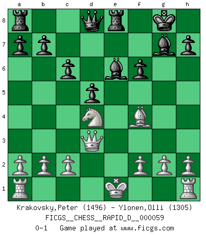 Last move : 0-1 2011 August 12 8:20:46 [Event "FICGS__CHESS__RAPID_D__000059"] [Site "FICGS"] [Date "2011.06.20"] [Round "1"] [White "Krakovsky,Peter"] [Black "Ylonen,Olli"] [Result "0-1"] [WhiteElo "1496"] [BlackElo "1305"] 1.e4 e5 2.Nf3 Nc6 3.Bb5 f5 4.Nc3 fxe4 5.Nxe4 Nf6 6.Qe2 d5 7.Nxf6+ gxf6 8.d4 Bg7 9.dxe5 O-O 10.e6 Ne5 11.Bf4 c6 12.Bd3 Nxd3+ 13.Qxd3 Bxe6 14.Nd4 Re8 0-1 Ruy Lopez : Schliemann defense, Berger variation Kingside Castling by player Black (move 9) Player Black won this chess game. Follow this game move after move (download)You may learn much more from a game you lose than from a game you win. You will have to lose hundreds of games before becoming a good player. (Jose Raul Capablanca) Der Bart als Geschlechtszeichen mitten im Gesicht ist obszön. Daher gefällt er den Weibern. [Zugegeben, kein Schachzitat, aber unglaublich originell] (Arthur Schopenhauer) El Ajedrez es la vida. (Bobby Fischer) Même un GMI sait rarement calculer sur plus de cinq coups une attaque à sacrifices. (Rudolf Spielmann) Luck is what you have left over after you give 100 percent. (Langston Coleman)
