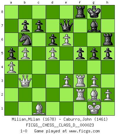 Last move : 1-0 2007 April 30 19:20:8 [Event "FICGS__CHESS__CLASS_D__000023"] [Site "FICGS"] [Date "2006.12.24"] [Round "1"] [White "Milian,Milan"] [Black "Caburro,John"] [Result "1-0"] [WhiteElo "1678"] [BlackElo "1461"] 1.c4 f5 2.Nc3 Nf6 3.g3 g6 4.Bg2 Bg7 5.d4 O-O 6.b4 d6 7.e3 a5 8.b5 Qe8 9.Nge2 e5 10.O-O e4 11.Qb3 Be6 12.Nf4 Bf7 13.a4 Nbd7 14.Ncd5 Nxd5 15.cxd5 Qe7 16.Ba3 g5 17.Ne6 Bxe6 18.dxe6 Nb6 19.Ra2 Rf6 20.d5 h5 21.Bc1 Rh6 22.f3 exf3 23.Rxf3 Rf8 24.Raf2 1-0 English : Anglo-Dutch defense Kingside Castling by player Black (move 5) Kingside Castling by player White (move 10) Player White won this chess game. Follow this game move after move (download)Suddenly it was obvious to me in my analysis I had missed what Fischer had found with the greatest of ease at the board. (Mikhail Botvinnik) Kleine Schachspieler machen Mist, und große Schachspieler machen Mist, aber große machen weniger Mist. (Fritz Sämisch) El Ajedrez es el juego mas altamente simbólico, pero las agresiones estan por lo tanto aún mas francamente representadas en la partida. Tal vez comenzo como un juego de guerra; Algo como la representación de una batalla en miniatura entre las fuerzas de dos reinos. (Karl Meninger) A ce moment-là, je menaçais de comprendre la position ! (Clément L'Heureux) In fact if nothing is done against this teddy bear, hereby I announce that I would quit chess, rapid chess, blitz chess, postal chess, email chess, server chess and correspondence chess I will then switch to a table game where teddy bears aren't going to be seen for a while, like Poker, or Roulette, all 18+ games. (Elmer Valderrama)