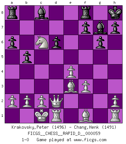 Last move : 1-0 2011 July 18 19:57:53 [Event "FICGS__CHESS__RAPID_D__000059"] [Site "FICGS"] [Date "2011.06.20"] [Round "1"] [White "Krakovsky,Peter"] [Black "Chang,Henk"] [Result "1-0"] [WhiteElo "1496"] [BlackElo "1491"] 1.e4 c5 2.Nf3 d6 3.d4 cxd4 4.Nxd4 Nf6 5.Nc3 a6 6.Be3 g6 7.f3 Bg7 8.Qd2 O-O 9.O-O-O Nc6 10.g4 b5 11.Nxc6 Qc7 12.g5 Qxc6 13.gxf6 Bxf6 14.Nd5 Bg7 15.Nxe7+ Kh8 16.Nxc6 1-0 Sicilian : Najdorf, Byrne (English) attack Kingside Castling by player Black (move 8) Queenside Castling by player White (move 9) Player White won this chess game. Follow this game move after move (download)Chess is like life. (Boris Spassky) Das Zentrum ist der Balkan des Schachbretts - Kriegshandlungen können in jedem Moment ausbrechen. (Aaron Nimzowitsch) Debes de llevar a tu oponente hacia un profundo y obscuro bosque donde 2+2=5, y el camino que conduce a la salida es suficientemente ancho para solamente uno. (Mikhail Tal) A chaque perte on perd un peu de soi. (Joël Lautier) Political correctness is subjecting us to gross incompetence. (Johann Piek)