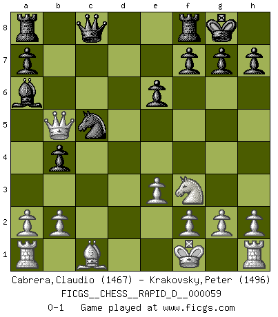 Last move : 0-1 2011 August 3 1:23:31 [Event "FICGS__CHESS__RAPID_D__000059"] [Site "FICGS"] [Date "2011.06.20"] [Round "1"] [White "Cabrera,Claudio"] [Black "Krakovsky,Peter"] [Result "0-1"] [WhiteElo "1467"] [BlackElo "1496"] 1.d4 d5 2.c4 c6 3.Nf3 e6 4.Nc3 Nf6 5.e3 Nbd7 6.Bd3 dxc4 7.Bxc4 b5 8.Bd3 Bb7 9.Qe2 b4 10.Na4 c5 11.dxc5 Bxc5 12.Bb5 O-O 13.Bxd7 Nxd7 14.Qb5 Qc8 15.Nxc5 Nxc5 16.Kf1 Ba6 0-1 QGD Slav : 3.Nf3 Kingside Castling by player Black (move 12) Player Black won this chess game. Follow this game move after move (download)By the beauty of his games, the clarity of his play, and the brilliance of his ideas, Fischer made himself an artist of the same stature as Brahms, Rembrandt, and Shakespeare. (David Levy) Stelle das Brett so, daß die Sonne in die Augen deines Gegners scheint. (Ruy López) Yo siempre he tenido un ligero sentimiento de lástima por una persona que no tiene conocimiento del Ajedrez. (Siegbert Tarrasch) Il vaut mieux sacrifier les pièces de l'adversaire. (Xavier Tartacover) The best teachers teach from the heart, not from the book. (Author unknown)