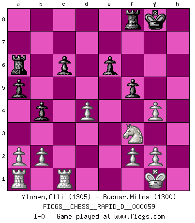Last move : 1-0 2011 October 17 8:58:52 [Event "FICGS__CHESS__RAPID_D__000059"] [Site "FICGS"] [Date "2011.06.20"] [Round "1"] [White "Ylonen,Olli"] [Black "Budnar,Milos"] [Result "1-0"] [WhiteElo "1305"] [BlackElo "1300"] 1.Nf3 Nf6 2.c4 e6 3.Nc3 d5 4.d4 c6 5.Bg5 dxc4 6.e4 Be7 7.Bxc4 h6 8.Bf4 Bb4 9.Qc2 Bxc3 10.Qxc3 O-O 11.Nd2 b5 12.Be2 a5 13.O-O b4 14.Qg3 Nh7 15.Bxb8 Qg5 16.Qxg5 Nxg5 17.Bf4 Ba6 18.Bxa6 Rxa6 19.Bxg5 hxg5 20.h3 g6 21.Rfc1 f5 22.exf5 gxf5 23.Nf3 g4 24.hxg4 1-0 Reti Opening Kingside Castling by player Black (move 10) Kingside Castling by player White (move 13) Player White won this chess game. Follow this game move after move (download)The defensive power of a pinned piece is only imaginary. (Aaron Nimzovich) Garry Kasparov war erst in der Großmeister-Organisation GMA, dann in der Profischach-Vereinigung PCA, zum Schluss kehrte er wieder in den Schoß der FIDE zurück. Aber gut, manche Leute sind flexibel (Viswanathan Anand) Ciertamente, de todas la drogas del mundo, el Ajedrez debe ser el mas placentero permamentemente. (Assiac) Les Echecs ne sont pas pour les âmes timides. Ils requièrent un homme entier, qui ne s'arrête pas aveuglément à ce qui a été déjà établi, mais qui tente individuellement de sonder les profondeurs du jeu. (W. Steinitz) I don't believe in psychology. I believe in good moves. (Bobby Fischer)