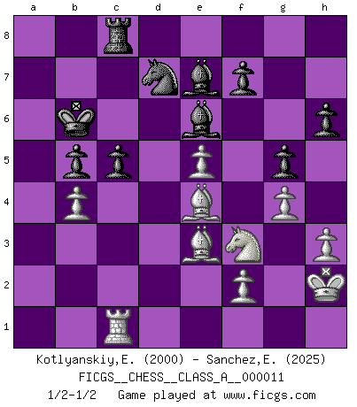 Last move : 1/2-1/2 2007 March 8 0:15:37 [Event "FICGS__CHESS__CLASS_A__000011"] [Site "FICGS"] [Date "2006.12.25"] [Round "1"] [White "Kotlyanskiy,Edward"] [Black "Sanchez,Eduardo"] [Result "1/2-1/2"] [WhiteElo "2000"] [BlackElo "2025"] 1.e4 e5 2.Nf3 Nc6 3.Bb5 a6 4.Ba4 Nf6 5.O-O Nxe4 6.d4 b5 7.Bb3 d5 8.dxe5 Be6 9.Nbd2 Nc5 10.c3 Bg4 11.Bc2 Qd7 12.Re1 d4 13.h3 Be6 14.cxd4 Nxd4 15.Nxd4 Qxd4 16.Nf3 Qxd1 17.Rxd1 Rd8 18.Rxd8+ Kxd8 19.Be3 h6 20.Rd1+ Kc8 21.b3 Nd7 22.a4 c5 23.axb5 axb5 24.Ra1 Kc7 25.Be4 Kb6 26.b4 Be7 27.Rb1 Rb8 28.Rc1 Rc8 29.Kh2 g5 30.g4 1/2-1/2 Ruy Lopez : Open, 7.Bb3 Kingside Castling by player White (move 5) This chess game ended in a draw. Follow this game move after move (download)Every Chess master was once a beginner. (Chernev) Ja, jede Frau in Holland liebt mich bestimmt, und alle Männer hassen mich. (Loek van Wely) Aunque la mayoría de la gente disfruta observar las partidas de los grandes Maestros de ataque, algunos de los jugadores mas notables en la historia han sido los jugadores silenciosos posicionales. Lentamente ellos te aplastan despojandote de tu espacio, congestionando tus piezas y dejandote virtualmente sin nada que hacer. (Yasser Seirawan) On peut tirer plus d'utilité d'une partie perdue que de 100 parties gagnées. (Capablanca) Computers are like Old Testament gods; lots of rules and no mercy. (Joseph Campbell)