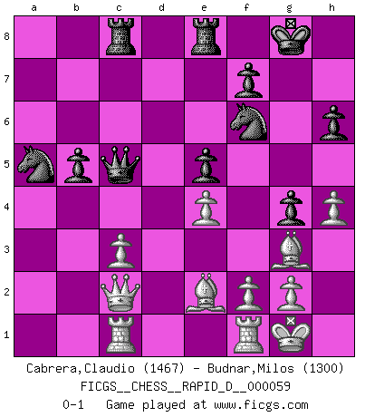 Last move : 0-1 2011 November 3 12:29:48 [Event "FICGS__CHESS__RAPID_D__000059"] [Site "FICGS"] [Date "2011.06.20"] [Round "1"] [White "Cabrera,Claudio"] [Black "Budnar,Milos"] [Result "0-1"] [WhiteElo "1467"] [BlackElo "1300"] 1.e4 e5 2.Nc3 Bb4 3.Nd5 Nc6 4.c3 Ba5 5.b4 Bb6 6.Nf3 Nf6 7.Nxb6 cxb6 8.d3 d5 9.Qc2 O-O 10.b5 Na5 11.Bg5 h6 12.Bh4 Re8 13.Be2 Bg4 14.O-O dxe4 15.dxe4 Bxf3 16.Bxf3 Qe7 17.Rad1 g5 18.Bg3 Qc5 19.a4 Rac8 20.Rc1 a6 21.bxa6 bxa6 22.h4 g4 23.Be2 b5 24.axb5 axb5 0-1 This chess game has been lost on time (started : 2011.06.20 19:36:17) Vienna game Kingside Castling by player Black (move 9) Kingside Castling by player White (move 14) Player Black won this chess game. Follow this game move after move (download)In blitz, the Knight is stronger than the Bishop. (Vlastimil Hort) Darum geht es im Schach. Einen Tag gibst du deinem Gegner eine Lektion, am nächsten Tag gibt er dir eine. (Robert James Fischer) El juego de Fischer siempre fue nítido, racional y brillante. Uno de los mejores por siempre. (Dave Regis) Il s'avisa de me proposer d'apprendre les échecs qu'il jouait un peu... me voilà forcené des échecs. J'achète un échiquier, je m'enferme dans ma chambre, j'y passe des jours et des nuits à vouloir apprendre par cur toutes les parties. (Jean-Jacques Rousseau, Confessions) It's not the size of the dog in the fight, it's the size of the fight in the dog. (Mark Twain)