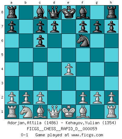 Last move : 0-1 2011 October 3 23:21:16 [Event "FICGS__CHESS__RAPID_D__000059"] [Site "FICGS"] [Date "2011.06.20"] [Round "1"] [White "Adorjan,Attila"] [Black "Kehayov,Yulian"] [Result "0-1"] [WhiteElo "1486"] [BlackElo "1354"] 1.e4 e5 2.Nf3 Nc6 3.d4 exd4 4.Nxd4 Nf6 5.Nxc6 bxc6 0-1 This chess game has been lost on time (started : 2011.06.20 19:36:17) Scotch : Schmidt variation Player Black won this chess game. Follow this game move after move (download)We don't really know how the game was invented, though there are suspicions. As soon as we discover the culprits, we'll let you know. (Bruce Pandolfini) Schach ist mein Leben, meine Leidenschaft, was ich gelernt habe und seit meinem 14. Lebensjahr profimässig praktiziere. Darauf zu verzichten, würde mir sehr schwer fallen. (Viktor Kortschnoi) Cuando le juegas a Fischer, no es una cuestion de si vas a ganar o perder. Es una cuestion de si vas a sobrevivir. (Boris Spassky) D'abord les bases : Jouez et étudiez, puis étudiez et jouez, ensuite jouez et étudiez, puis étudiez et jouez. Deuxièmement : Donnez toujours le meilleur de vous-même ! (Ken Smith) Home computers are being called upon to perform many new functions, including the consumption of homework formerly eaten by the dog. (Doug Larson)