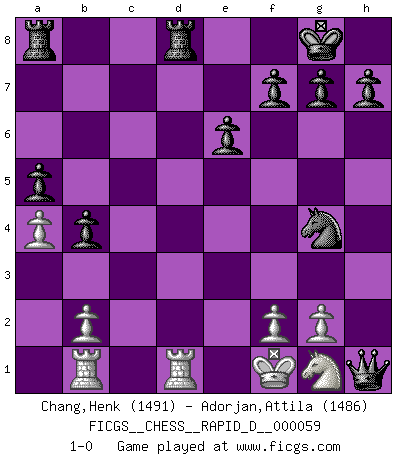 Last move : 1-0 2011 September 13 22:20:9 [Event "FICGS__CHESS__RAPID_D__000059"] [Site "FICGS"] [Date "2011.06.20"] [Round "1"] [White "Chang,Henk"] [Black "Adorjan,Attila"] [Result "1-0"] [WhiteElo "1491"] [BlackElo "1486"] 1.d4 d5 2.c4 c6 3.Nf3 Nf6 4.Nc3 dxc4 5.e3 b5 6.a4 b4 7.Na2 e6 8.Bxc4 Nbd7 9.Bd2 a5 10.Rc1 Bd6 11.Bb3 c5 12.dxc5 Nxc5 13.O-O Nxb3 14.Qxb3 Bb7 15.Rc4 Bd5 16.Qd3 Bxf3 17.Rd4 Bd5 18.e4 Bxe4 19.Rxe4 Bxh2+ 20.Kxh2 Qxd3 21.R4e1 Qxd2 22.Rb1 Qh6+ 23.Kg1 O-O 24.Nc1 Rfd8 25.Ne2 Ng4 26.Rfd1 Qh2+ 27.Kf1 Qh1+ 28.Ng1 1-0 This chess game has been lost on time (started : 2011.06.20 19:36:17) QGD Slav : 5.e3 (Alekhine variation) Kingside Castling by player White (move 13) Kingside Castling by player Black (move 23) Player White won this chess game. Follow this game move after move (download)Fischer is under obligation to nobody. (Joseph Platz) Fischer machte Schach einfach zu einer aufregenden Sache, wann immer er sich ans Brett setzte. (Raymond Keene) Todo se encuentra en un estado de flujo y esto incluye al mundo del Ajedrez. (Mikhail Botvinnik) Un journaliste : 'Vous préférez avoir une dame de plus sur l'échiquier ou au lit ?' Boris Spassky : 'Ca dépend de la position.' Panic is a sudden desertion of us, an a going over to the enemy of our imagination. (Christian Nevell Bovee)