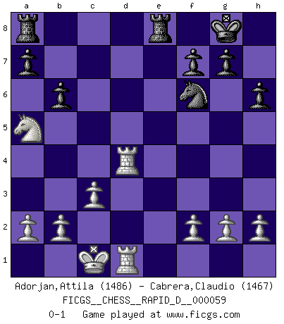 Last move : 0-1 2011 September 5 10:18:21 [Event "FICGS__CHESS__RAPID_D__000059"] [Site "FICGS"] [Date "2011.06.20"] [Round "1"] [White "Adorjan,Attila"] [Black "Cabrera,Claudio"] [Result "0-1"] [WhiteElo "1486"] [BlackElo "1467"] 1.e4 e6 2.d4 d5 3.Nd2 c5 4.exd5 exd5 5.Bb5+ Bd7 6.Qe2+ Qe7 7.Bxd7+ Nxd7 8.dxc5 Qxe2+ 9.Nxe2 Bxc5 10.Nb3 Bb4+ 11.c3 Bd6 12.Bf4 Bxf4 13.Nxf4 Ngf6 14.O-O-O O-O 15.Nxd5 Nxd5 16.Rxd5 Nf6 17.Rd4 Rfe8 18.Rhd1 h6 19.Na5 b6 0-1 This chess game has been lost on time (started : 2011.06.20 19:36:17) French : Tarrasch, Open, 4.ed ed Queenside Castling by player White (move 14) Kingside Castling by player Black (move 14) Player Black won this chess game. Follow this game move after move (download)The mistakes are there, waiting to be made. (Savielly Tartakower) Nicht daß Diemer aus Opportunismus Mitglied der NSDAP geworden wäre. Er war ein Fanatiker, in allem, was er tat. (Hans Ree) El Ajedrez es en su esencia, un juego. En su forma, un arte. Y en su ejecución, una ciencia. (Baron Tassilo) Toutes les manuvres exécutées sur une colonne ouverte ont pour but ultime l'intrusion définitive sur la septième ou la huitième rangée, en plein cur de la position ennemie. (Aaron Nimzovitch) The smarter you play, the luckier you'll be. (Mark Pilarski)