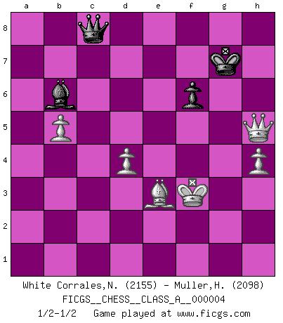 Last move : 1/2-1/2 2006 September 28 10:6:32 [Event "FICGS__CHESS__CLASS_A__000004"] [Site "FICGS"] [Date "2006.05.04"] [Round "1"] [White "White Corrales,Nicolas"] [Black "Muller,Henri"] [Result "1/2-1/2"] [WhiteElo "2155"] [BlackElo "2098"] 1.d4 Nf6 2.Nf3 e6 3.c4 d5 4.Nc3 Nbd7 5.cxd5 exd5 6.Bf4 c6 7.e3 Be7 8.h3 O-O 9.Bd3 Re8 10.O-O Nf8 11.Ne5 Bd6 12.Bg3 Ng6 13.f4 Qe7 14.a3 Bc7 15.Qf3 a6 16.Rae1 Qd8 17.Rf2 Ne7 18.f5 Kf8 19.Rc1 Bd6 20.e4 Bb8 21.exd5 Nexd5 22.Re2 Ba7 23.Bf2 Ne7 24.Rd1 Kg8 25.Ne4 Nxe4 26.Bxe4 Nxf5 27.Bxf5 Bxf5 28.Qxf5 f6 29.Nxc6 bxc6 30.Rxe8+ Qxe8 31.b4 Bb6 32.Re1 Qc8 33.Qc2 Qc7 34.Qc4+ Kf8 35.Re6 Rc8 36.Qxa6 Re8 37.Rxe8+ Kxe8 38.a4 Kf8 39.Qc4 Qd7 40.b5 cxb5 41.axb5 Qa7 42.Qc6 Ke7 43.g4 g6 44.Kg2 Kf7 45.Qd5+ Kg7 46.Kf3 Qc7 47.h4 Qc8 48.Be3 h5 49.gxh5 gxh5 50.Qxh5 1/2-1/2 Queen's pawn game Kingside Castling by player Black (move 8) Kingside Castling by player White (move 10) 10 pieces endgame at move 50 : White KQBPPP , Black KQBP WHITE : King + 1 Queen 1 Bishop 3 Pawns BLACK : King + 1 Queen 1 Bishop 1 Pawn This chess game ended in a draw. Follow this game move after move (download)Modern Chess is too much concerned with things like Pawn structure. Forget it, Checkmate ends the game. (Nigel Short) Ein bischen Romantik kann weder im Schach noch in der Liebe schaden. Also versuche ich mich ab und zu daran zu erinnern. (Nigel Short) Alekhine es un poeta que crea un trabajo de arte de algo que raramente inspiraría a otra persona a mandar una tarjeta postal. (Max Euwe) Ce qui caractérise les parties de combat, c'est que si le défenseur a constamment de difficiles problèmes à résoudre, l'attaquant doit chercher sans relâche de nouvelles possibilités d'attaque. (Koblentz) The project of the man are lower than those of the sky. (Chinese proverb)