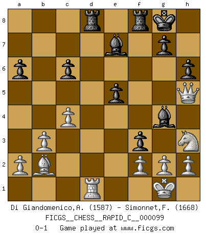 Last move : 0-1 2011 August 26 11:56:40 [Event "FICGS__CHESS__RAPID_C__000099"] [Site "FICGS"] [Date "2011.06.21"] [Round "1"] [White "Di Giandomenico,Alfonso"] [Black "Simonnet,Franck"] [Result "0-1"] [WhiteElo "1587"] [BlackElo "1668"] 1.e4 c5 2.Nf3 d6 3.d4 cxd4 4.Nxd4 Nf6 5.Nc3 e5 6.Nf3 a6 7.Be2 Be7 8.O-O O-O 9.Be3 Nc6 10.Nd2 d5 11.exd5 Nxd5 12.Nxd5 Qxd5 13.Bf3 Qb5 14.b3 Be6 15.c4 Qa5 16.Bxc6 bxc6 17.Qf3 Rad8 18.Ne4 f5 19.Ng5 Bd7 20.Qh5 h6 21.Nh3 f4 22.Bc1 Qc3 23.Rb1 f3 24.Bb2 Qd2 25.Rfd1 Qxd1+ 26.Rxd1 Bg4 0-1 Sicilian Kingside Castling by player White (move 8) Kingside Castling by player Black (move 8) Player Black won this chess game. Follow this game move after move (download)The older I grow, the more I value pawns. (Paul Keres) Ich verstehe mehr vom Schach als irgendein anderer lebender Meister. (José Raúl Capablanca) Fischer no está bajo la obligación de nadie. (Joseph Platz) Botvinnik disait en comparant les échecs à la musique: Il existe une science dont le but est l'étude de l'acoustique et des sons. Mais il y a aussi un art qui se sert de l'océan des sons : c'est la musique. De toute évidence, il en est de même pour la pensée. La logique est l'étude des lois de la réflexion et les échecs reflètent, en tant qu'art, le côté logique de la réflexion, sous la forme d'images artistiques... Extrait de Fischer - Spassky, Reykjavik 1972 par Alexander & F. Wyndham (Ed. Solar), p 37. Somewhere in the world there is an epigram for every dilemma. (Hendrik Willem van Loon)