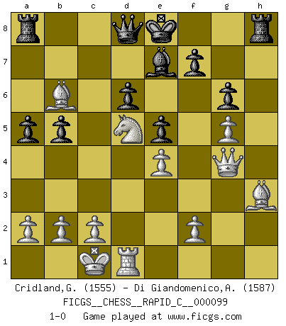 Last move : 1-0 2011 August 18 8:17:6 [Event "FICGS__CHESS__RAPID_C__000099"] [Site "FICGS"] [Date "2011.06.21"] [Round "1"] [White "Cridland,Graham"] [Black "Di Giandomenico,Alfonso"] [Result "1-0"] [WhiteElo "1555"] [BlackElo "1587"] 1.e4 c5 2.Nf3 e6 3.d4 cxd4 4.Nxd4 Nf6 5.Nc3 d6 6.g4 h6 7.h4 Bd7 8.Rg1 Nc6 9.g5 hxg5 10.hxg5 Nxd4 11.Qxd4 Ng4 12.Rxg4 e5 13.Qd1 Bxg4 14.Qxg4 Be7 15.Be3 a6 16.O-O-O g6 17.Bh3 b5 18.Nd5 a5 19.Bb6 1-0 Sicilian : Anderssen variation Queenside Castling by player White (move 16) Player White won this chess game. Follow this game move after move (download)A win by an unsound combination, however showy, fills me with artistic horror. (Wilhelm Steinitz) Es macht mich traurig, wenn ich sehe, dass Golfprofis mehr verdienen als Schachsportler. Obwohl ich davon überzeugt bin, dass wir Schachspieler viel härter trainieren müssen als die Golfer. (Alexandra Kosteniuk) El Ajedrez es un regaderazo frío para la mente. (Sir John Simon) Il vaut mieux sacrifier les pièces de l'adversaire. (Xavier Tartacover) Do not put your faith in what statistics say until you have carefully considered what they do not say. (William W. Watt)