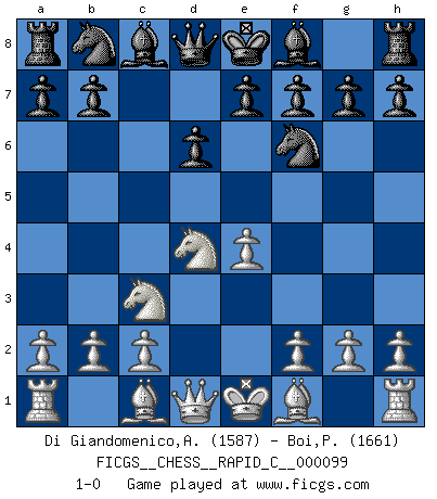 Last move : 1-0 2011 August 24 9:59:42 [Event "FICGS__CHESS__RAPID_C__000099"] [Site "FICGS"] [Date "2011.06.21"] [Round "1"] [White "Di Giandomenico,Alfonso"] [Black "Boi,Paolo"] [Result "1-0"] [WhiteElo "1587"] [BlackElo "1661"] 1.e4 c5 2.Nf3 d6 3.d4 cxd4 4.Nxd4 Nf6 5.Nc3 1-0 This chess game has been lost on time (started : 2011.06.21 20:25:49) Sicilian Player White won this chess game. Follow this game move after move (download)First-class players lose to second-class players because second-class players sometimes play a first-class game. (Siegbert Tarrasch) Jede Eröffnung ist gut genug um gespielt zu werden, wenn nur ihr Ruf schlecht genug ist. (Savielly Grigorievitsch Tartakower) El Ajedrez es parte de la cultura, y si una cultura esta en decadencia, entonces también el Ajedrez declinará. (Mikhail Botvinnik) Soyez une menace à chaque fois que vous vous asseyez pour jouer. (Ken Smith) Chess, like love, like music, has the power to make people happy. (Siegbert Tarrasch)