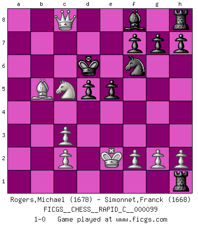 Last move : 1-0 2011 June 28 18:27:41 [Event "FICGS__CHESS__RAPID_C__000099"] [Site "FICGS"] [Date "2011.06.21"] [Round "1"] [White "Rogers,Michael"] [Black "Simonnet,Franck"] [Result "1-0"] [WhiteElo "1678"] [BlackElo "1668"] 1.e4 c5 2.Nf3 d6 3.d4 cxd4 4.Nxd4 Nf6 5.Nc3 a6 6.Be3 e5 7.Nb3 b5 8.a4 bxa4 9.Nxa4 Nbd7 10.Bc4 Bb7 11.Nc3 Nxe4 12.Qf3 Ndf6 13.Na5 Qc8 14.Nxb7 Nxc3 15.bxc3 d5 16.Rxa6 Rxa6 17.Bb5+ Ke7 18.Bc5+ Qxc5 19.Nxc5 Ra1+ 20.Ke2 Rxh1 21.Qf5 Kd6 22.Qc8 1-0 Sicilian : Najdorf, Byrne (English) attack Player White won this chess game. Follow this game move after move (download)I am still a victim of Chess. It has all the beauty of art and much more. It cannot be commercialized. Chess is much purer than art in its social position. (Marcel Duchamp) Smyslow ist ein Beweis dafür, dass ich noch zehn Jahre spielen kann! [der 75 jährige über den 85 jährigen] (Viktor Kortschnoi) El juego de Fischer siempre fue nítido, racional y brillante. Uno de los mejores por siempre. (Dave Regis) Si je n'étais pas joueur d'échecs, je serais le meilleur dans quelque chose d'autre. (Anatoli Karpov) The Internet is so big, so powerful and pointless that for some people it is a complete substitute for life. (Andrew Brown)