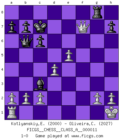 Last move : 1-0 2007 January 13 20:47:13 [Event "FICGS__CHESS__CLASS_A__000011"] [Site "FICGS"] [Date "2006.12.25"] [Round "1"] [White "Kotlyanskiy,Edward"] [Black "Oliveira,Carlos"] [Result "1-0"] [WhiteElo "2000"] [BlackElo "2027"] 1.e4 c6 2.d4 d6 3.f4 Qc7 4.Nc3 Nd7 5.Nf3 e5 6.Bc4 Be7 7.O-O Ngf6 8.fxe5 dxe5 9.Nxe5 Nxe5 10.Bf4 Qb6 11.Bxe5 Bg4 12.Qd3 O-O-O 13.Kh1 Nd7 14.Bxg7 Rhg8 15.Rxf7 Bb4 16.e5 Bh5 17.Rxd7 Rxd7 18.Bxg8 Rxg7 19.Qf5+ Kb8 20.Qxh5 Bxc3 21.Qe8+ Kc7 22.Qf8 Rxg8 23.Qf7+ 1-0 Caro-Kann defense Kingside Castling by player White (move 7) Queenside Castling by player Black (move 12) Player White won this chess game. Follow this game move after move (download)The stomach is an essential part of the Chess master. (Bent Larsen) Kein Großmeister ist normal. Sie unterscheiden sich nur im Ausmaß Ihrer Verrücktheit. (Viktor Kortschnoi) Tu sabes que vas a perder. Aún cuando tenía la ventaja, yo sabía que iba a perder. - al estar jugando con Fischer (Andrew Soltis) Demandez au pauvre Cg1 ce qu'il en pense. Eduard Gufeld à propos de la variante Saemisch de l'Est-Indienne. A shortcut is the longest distance between two points. (Don Groves)