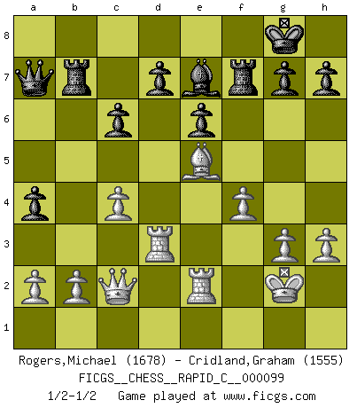 Last move : 1/2-1/2 2011 July 14 19:1:43 [Event "FICGS__CHESS__RAPID_C__000099"] [Site "FICGS"] [Date "2011.06.21"] [Round "1"] [White "Rogers,Michael"] [Black "Cridland,Graham"] [Result "1/2-1/2"] [WhiteElo "1678"] [BlackElo "1555"] 1.e4 c5 2.Nf3 e6 3.d4 cxd4 4.Nxd4 Nc6 5.Nc3 Qc7 6.Be2 a6 7.O-O Nf6 8.Be3 Bb4 9.Na4 Be7 10.Nxc6 bxc6 11.Nb6 Rb8 12.Nxc8 Qxc8 13.Bd4 O-O 14.e5 Nd5 15.c4 Nf4 16.g3 Nxe2+ 17.Qxe2 f6 18.Rad1 fxe5 19.Bxe5 Rb7 20.f4 a5 21.Kg2 Rf7 22.Rf2 Qe8 23.Qc2 Qa8 24.Rfd2 Qa7 25.Rd3 a4 26.R1d2 Bb4 27.Re2 Be7 28.Qd1 Qa6 29.Rc2 Qa7 30.Rcd2 Bb4 31.Rf2 Bc5 32.Re2 Qa6 33.Rc2 Qa7 34.h3 Be7 35.Rcd2 Bb4 36.Re2 Bc5 37.Qc2 Be7 1/2-1/2 Sicilian : Taimanov (Bastrikov) variation Kingside Castling by player White (move 7) Kingside Castling by player Black (move 13) This chess game ended in a draw. Follow this game move after move (download)With or without the title, Bobby Fischer was unquestionably the greatest player of his time. (Burt Hochberg) Schach ist eine Sache der genauen Beurteilung, wann man zuschlagen und wann man sich ducken muss. (Robert James Fischer) ¿Esta Bobby Fischer algo cuerdo?. (Salo Flohr) La tactique, c'est ce que vous faites quand il y a quelque chose à faire; la stratégie, c'est ce que vous faites quand il n'y a rien à faire. (Savielli Tartacower) I couldn't make any sense out of what this particular thread is about. It sounds like R2 D2 computer speaking. A space fight ?!? Some 'command' problems in Moscow ? Some killers & narcotic addicts attacking some game & a god wannabe ?? (Dinesh De Silva, lost in a russian conflict in FICGS forum)