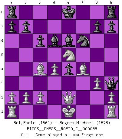 Last move : 0-1 2011 August 5 21:16:35 [Event "FICGS__CHESS__RAPID_C__000099"] [Site "FICGS"] [Date "2011.06.21"] [Round "1"] [White "Boi,Paolo"] [Black "Rogers,Michael"] [Result "0-1"] [WhiteElo "1661"] [BlackElo "1678"] 1.e4 e5 2.Nf3 Nc6 3.Bb5 f5 4.Nc3 fxe4 5.Nxe4 d5 6.Nxe5 dxe4 7.Nxc6 Qg5 8.Qe2 Nf6 9.f4 Qxf4 10.Ne5 c6 11.d4 Qh4+ 12.g3 Qh3 13.Bc4 Be6 14.Bf4 Bd6 0-1 This chess game has been lost on time (started : 2011.06.21 20:25:49) Ruy Lopez : Schliemann defense, Berger variation Player Black won this chess game. Follow this game move after move (download)Half the variations which are calculated in a tournament game turn out to be completely superfluous. Unfortunately, no one knows in advance which half. (Jan Tinman) Über Kasparov: Es ist offensichtlich, daß er in einem totalitären Staat aufwuchs und deshalb zu diktatorischen Zügen neigt. (Viktor Kortschnoi) Siempre es mucho mejor sacrificar las piezas de tu oponente. (Savielly Tartakover) Pour moi, les échecs ne sont pas un jeu mais un art. (Alexandre Alekhine) You know what they say : You lie down with the Devil, you wake up in Hell. (Horatio Caine, C.S.I. Miami)