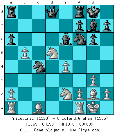 Last move : 0-1 2011 July 5 2:6:55 [Event "FICGS__CHESS__RAPID_C__000099"] [Site "FICGS"] [Date "2011.06.21"] [Round "1"] [White "Price,Eric"] [Black "Cridland,Graham"] [Result "0-1"] [WhiteElo "1528"] [BlackElo "1555"] 1.Nf3 Nf6 2.c4 g6 3.g3 Bg7 4.d4 O-O 5.Nc3 d6 6.Bg2 Nbd7 7.O-O e5 8.e4 a6 9.b4 exd4 10.Nxd4 c5 11.bxc5 dxc5 12.Nde2 Ne5 13.Qb3 Be6 14.Nd5 b5 15.cxb5 c4 16.Qxc4 Nxc4 0-1 Reti Opening Kingside Castling by player Black (move 4) Kingside Castling by player White (move 7) Player Black won this chess game. Follow this game move after move (download)When you absolutely don't know what to do anymore, it is time to panic. (John van der Wiel) Mutter, ich bin eben Ex-Weltmeister geworden. --beim nach Hause Kommen nach dem Verlust des WM-Titels an Mihail Botvinnik -- (Mikhail Nekhemyevich Tal) El jugador táctico debe saber que hacer cuando algo se debe de hacer. El estratégico debe saber que hacer cuando nada se debe de hacer. (Savielly Tartakover) Il (Jacob Murray) ne joue pas pour le bon coup, mais pour le meilleur. (Eloi Relange) He who is a good ruler must first have been ruled. (Aristotle)