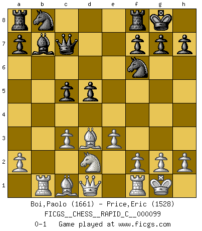 Last move : 0-1 2011 August 5 21:16:35 [Event "FICGS__CHESS__RAPID_C__000099"] [Site "FICGS"] [Date "2011.06.21"] [Round "1"] [White "Boi,Paolo"] [Black "Price,Eric"] [Result "0-1"] [WhiteElo "1661"] [BlackElo "1528"] 1.d4 Nf6 2.c4 e6 3.Nc3 Bb4 4.e3 c5 5.Bd3 Bxc3+ 6.bxc3 O-O 7.Nf3 b6 8.O-O Bb7 9.Nd2 d5 10.cxd5 exd5 11.dxc5 bxc5 12.Rb1 Qc7 0-1 This chess game has been lost on time (started : 2011.06.21 20:25:49) Nimzo-Indian : 4.e3 c5 Kingside Castling by player Black (move 6) Kingside Castling by player White (move 8) Player Black won this chess game. Follow this game move after move (download)Chess is so inspiring that I do not believe a good player is capable of having an evil thought during the game. (Wilhelm Steinitz) Matt entspricht nicht immer den Tatsachen. (Savielly Grigorievitsch Tartakower) Si tu oponente no puede hacer nada activo, entonces no apures la posición; En vez de eso, dejalo estar sentado ahí, sufriendo y rogandote por un empate. (Jeremy Silman) Botvinnik disait en comparant les échecs à la musique: Il existe une science dont le but est l'étude de l'acoustique et des sons. Mais il y a aussi un art qui se sert de l'océan des sons : c'est la musique. De toute évidence, il en est de même pour la pensée. La logique est l'étude des lois de la réflexion et les échecs reflètent, en tant qu'art, le côté logique de la réflexion, sous la forme d'images artistiques... Extrait de Fischer - Spassky, Reykjavik 1972 par Alexander & F. Wyndham (Ed. Solar), p 37. Beta. Software undergoes beta testing shortly before it's released. Beta is latin for still doesn't work. (Anonymous)
