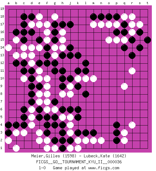 Last move : 1-0 2011 August 30 20:54:47 [Event "FICGS__GO__TOURNAMENT_KYU_II__000036"] [Site "FICGS"] [Date "2011.06.23"] [Round "1"] [Black "Meier,Gilles"] [White "Lubeck,Kate"] [Result "1-0"] [Rating 1 "1598"] [Rating 2 "1642"] 1.q16 d4 2.d16 r4 3.p3 q3 4.p4 q9 5.r13 r11 6.j17 c10 7.f3 e3 8.f4 c14 9.c15 d14 10.c6 d6 11.c4 c3 12.c5 d5 13.d7 e7 14.d8 e8 15.d9 e10 16.e9 f9 17.d10 e11 18.e6 f8 19.e5 b3 20.b4 f2 21.g2 e2 22.a3 a2 23.a4 b1 24.d11 d12 25.c12 c13 26.e12 d13 27.f12 f10 28.b12 g13 29.g12 h12 30.f13 g14 31.f14 f15 32.e15 e14 33.g15 f16 34.h11 j12 35.g11 j11 36.h10 j9 37.j10 k10 38.h9 h8 39.k9 j8 40.k11 l10 41.h13 h14 42.j13 k12 43.j14 h15 44.g16 h16 45.g17 f17 46.h17 e18 47.d18 d17 48.c17 e17 49.c18 g18 50.c16 b13 51.c11 b15 52.b16 a14 53.l11 m10 54.l12 r17 55.q17 r16 56.r15 s15 57.s14 q18 58.p18 r18 59.t15 q15 60.s16 p17 61.p16 o17 62.o18 n17 63.n18 m17 64.m18 p15 65.q14 o15 66.k13 s17 67.p2 q2 68.l8 g6 69.g5 h5 70.h4 j5 71.g7 f6 72.k6 j4 73.h3 j3 74.j2 k2 75.k3 l2 76.l3 m2 77.m3 g1 78.h1 f1 79.f5 g3 80.g4 n2 81.h6 f7 82.j6 k1 83.k5 j1 84.h2 1-0 Here are the names of the openings (joseki) played in the four corners : Corner q4 : r4 p3 Komoku (Somok, Xiao~mu`) 3-4 Point. The komoku (3-4) point is the traditional corner enclosure move.. Ikken Kakari (Hankan Keolch'im, Yi Gua`jiao~, 1-Space Low Pincer). The small knight move is the basic approach move to the 3-4 point stone. It has been continually used for over four centuries. There are limitless variations, with new moves constantly being discovered. Black 2 opens the door to a treaure store of joseki. Corner d4 : d4 f3 Hoshi (Hwajeom, Seongjeom, Xingwei`) 4-4 Point. The star or hoshi (4-4) point, emphasizing influence at the potential expense of territory. Ikken Kakari (Hankan Keolch'im, Yi Gua`jiao~, 1-Space Low Approach). Black 2 is the standard approach move to the 4-4. Player Black won this Go (weiqi, baduk) game. Follow this game move after move (download)One point in the center is worth ten in the corner. (Anonymous) God, you are such an idiot. - Actually, I thought I was more of a jerk. (Gregory House to Stacy Warner, House M.D.)