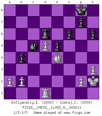 Last move : 1/2-1/2 2007 January 29 12:45:48 [Event "FICGS__CHESS__CLASS_A__000011"] [Site "FICGS"] [Date "2006.12.25"] [Round "1"] [White "Kotlyanskiy,Edward"] [Black "Czekaj,Christophe"] [Result "1/2-1/2"] [WhiteElo "2000"] [BlackElo "2000"] 1.e4 c5 2.Nf3 Nc6 3.d4 cxd4 4.Nxd4 e5 5.Nb5 d6 6.N1c3 a6 7.Na3 b5 8.Nd5 Nge7 9.c4 Nd4 10.cxb5 Nxd5 11.exd5 Bd7 12.Bd3 axb5 13.O-O Be7 14.Be3 b4 15.Nc2 Nxc2 16.Qxc2 h6 17.Qc4 Rb8 18.f4 Bb5 19.Qb3 Bxd3 20.Qxd3 O-O 21.fxe5 dxe5 22.Rac1 Qd7 23.Rfd1 Rfd8 24.Rc6 Rbc8 25.Rxc8 Qxc8 26.h3 Bc5 27.Bxc5 Qxc5+ 28.Kh1 Rd6 29.Qe4 f6 30.Kh2 1/2-1/2 Sicilian : Labourdonnais-Loewenthal (Kalashnikov) variation Kingside Castling by player White (move 13) Kingside Castling by player Black (move 20) This chess game ended in a draw. Follow this game move after move (download)A good sacrifice is one that is not necessarily sound but leaves your opponent dazed and confused. (Rudolph Spielmann) Bis jetzt ist Weiß einer wohlbekannten Analyse gefolgt. Aber jetzt begeht er einen schrecklichen Fehler: Er beginnt seinen eigenen Kopf zu benutzen. (Siegbert Tarrasch) Al jugar al Ajedrez entonces, podemos aprender: Primero: Previsión... Segundo: Prudencia... Tercero: Cautela... Y al final, aprendemos del Ajedrez el hábito de no ser desanimados por apariencias malas presentes en el estado de nuestros asuntos, el hábito de la esperanza por una oportunidad favorable y la perseveración de los secretos de los recursos. (Benjamin Franklin) Pour se monter efficace, un Cavalier a besoin d'avant-postes ! Les Cavaliers font les meilleurs bloqueurs de pions passés. The arrogant army will lose certainly the battle. (Chinese proverb)