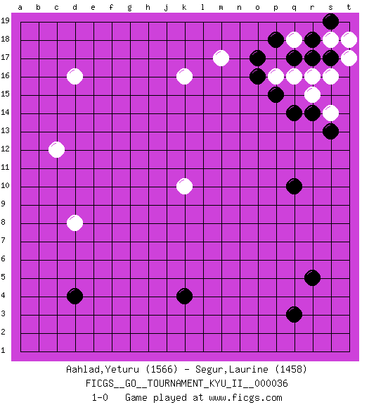 Last move : 1-0 2011 September 10 22:19:26 [Event "FICGS__GO__TOURNAMENT_KYU_II__000036"] [Site "FICGS"] [Date "2011.06.23"] [Round "1"] [Black "Aahlad,Yeturu"] [White "Segur,Laurine"] [Result "1-0"] [Rating 1 "1566"] [Rating 2 "1458"] 1.d4 d16 2.q3 q16 3.r5 c12 4.k4 k16 5.q10 d8 6.r14 k10 7.o17 m17 8.p15 p16 9.o16 s16 10.r17 r16 11.r18 s14 12.s13 r15 13.q14 s18 14.s17 t17 15.s19 t18 16.p18 q18 17.q17 1-0 This go game has been lost on time (started : 2011.06.23 17:30:2) Here are the names of the openings (joseki) played in the four corners : Corner d4 : d4 d8 Hoshi (Hwajeom, Seongjeom, Xingwei`) 4-4 Point. The star or hoshi (4-4) point, emphasizing influence at the potential expense of territory. Corner q16 : q16 r14 Hoshi (Hwajeom, Seongjeom, Xingwei`) 4-4 Point. The star or hoshi (4-4) point, emphasizing influence at the potential expense of territory. Ikken Kakari (Hankan Keolch'im, Yi Gua`jiao~, 1-Space Low Approach). Black 2 is the standard approach move to the 4-4. Player Black won this Go (weiqi, baduk) game. Follow this game move after move (download)The weak player fears ko, the strong player seeks it. (Bill Taylor) Political correctness is subjecting us to gross incompetence. (Johann Piek)