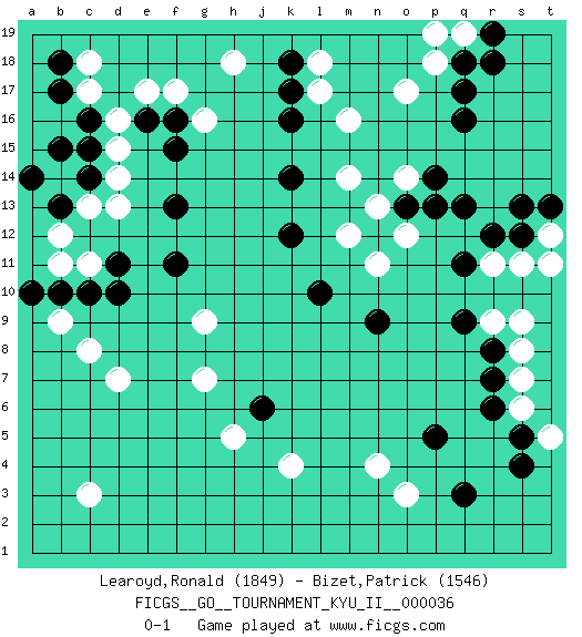Last move : 0-1 2011 November 26 14:12:19 [Event "FICGS__GO__TOURNAMENT_KYU_II__000036"] [Site "FICGS"] [Date "2011.06.23"] [Round "1"] [Black "Learoyd,Ronald"] [White "Bizet,Patrick"] [Result "0-1"] [Rating 1 "1849"] [Rating 2 "1546"] 1.q16 c3 2.q3 d16 3.q9 k4 4.f16 d13 5.f13 m16 6.k16 m14 7.k14 o17 8.q17 e17 9.q13 m12 10.k12 l17 11.k17 p18 12.q18 h18 13.k18 l18 14.l10 q19 15.r19 p19 16.r18 n11 17.o13 n13 18.n9 o14 19.p14 o12 20.p13 n4 21.p5 d7 22.d10 g7 23.j6 h5 24.c14 d14 25.c15 d15 26.b17 c17 27.c16 c18 28.b18 c13 29.b13 b14 30.b15 b12 31.a14 b11 32.c10 c11 33.d11 r11 34.q11 r9 35.r8 s9 36.r12 s8 37.r7 s11 38.s12 s7 39.r6 s6 40.s5 t12 41.t13 t11 42.s13 t5 43.s4 c8 44.b10 b9 45.a10 g9 46.f11 f17 47.e16 g16 48.f15 o3 0-1 This go game has been lost on time (started : 2011.06.23 17:30:2) Here are the names of the openings (joseki) played in the four corners : Corner d16 : d16 f16 Hoshi (Hwajeom, Seongjeom, Xingwei`) 4-4 Point. The star or hoshi (4-4) point, emphasizing influence at the potential expense of territory. Ikken Takagakari (Hankan Nop'dakeolch'im, Yi Gaojia, 1-Space High Approach). White typically responds at 6-4 or 3-10. White 4-10 is played when White finds play on the right side advantageous. White 4-8 or 3-8 may be played when White has support at top. Corner q16 : q16 m16 Hoshi (Hwajeom, Seongjeom, Xingwei`) 4-4 Point. The star or hoshi (4-4) point, emphasizing influence at the potential expense of territory. Player White won this Go (weiqi, baduk) game. Follow this game move after move (download)Everything happens on a grid-engraved board with black and white pieces, but if that's all you see then you don't know Go. (Pierre Audouard) Knowledge rests not upon truth alone, but upon error also. (Carl G. Jung)