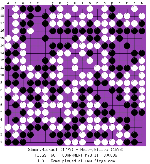 Last move : 1-0 2012 February 5 10:19:45 [Event "FICGS__GO__TOURNAMENT_KYU_II__000036"] [Site "FICGS"] [Date "2011.06.23"] [Round "1"] [Black "Simon,Mickael"] [White "Meier,Gilles"] [Result "1-0"] [Rating 1 "1779"] [Rating 2 "1598"] 1.q16 d4 2.q4 d16 3.f17 c14 4.d18 o17 5.r14 q18 6.f3 c6 7.d2 o3 8.r6 l3 9.j3 k17 10.c17 c3 11.c2 b2 12.c10 c11 13.c8 d10 14.d9 e10 15.e9 r9 16.f10 f11 17.g11 g10 18.f9 g12 19.e11 d11 20.f12 h11 21.f11 h9 22.r11 p9 23.b4 b3 24.b6 b7 25.c5 d6 26.d5 e5 27.a5 c7 28.e4 c4 29.e6 f5 30.d3 b5 31.c5 f6 32.e7 f7 33.d7 e8 34.d8 f8 35.g9 h10 36.g8 q2 37.r3 r2 38.s2 m10 39.g13 h12 40.f15 h13 41.g14 b16 42.h14 s17 43.s16 r17 44.r16 h7 45.g7 g6 46.h8 j8 47.j7 h6 48.j9 k8 49.j14 k11 50.p11 o15 51.o5 k5 52.q8 q9 53.n7 s9 54.o9 o10 55.n9 p10 56.n10 o11 57.p12 o12 58.p13 n11 59.m11 m12 60.l11 l10 61.l12 l13 62.m13 k12 63.p8 t6 64.s6 t8 65.t5 t7 66.s5 t12 67.s12 t10 68.t13 t11 69.s13 b17 70.a7 b8 71.b9 a8 72.a9 d5 73.b11 b12 74.b13 c13 75.a12 c12 76.b14 b15 77.n16 o16 78.k16 l17 79.l16 n17 80.m17 m18 81.m16 h17 82.j17 j18 83.j16 g18 84.f18 g17 85.a13 b18 86.c16 c18 87.d17 a15 88.c15 f4 89.e3 g3 90.g2 h3 91.h2 j4 92.k3 l2 93.h4 g4 94.k4 j5 95.l4 m4 96.l5 m5 97.l6 m6 98.l7 m7 99.l8 k9 100.m8 j1 101.j2 k1 102.k2 n4 103.q17 p17 104.p18 r18 105.g16 p4 106.p5 q3 107.r4 o13 108.p14 m14 109.o14 n14 110.g19 h19 111.k18 l18 112.h16 f19 113.e19 k19 114.g19 h18 115.h1 l1 116.o4 p3 117.t17 t18 118.t16 n6 119.o6 r8 120.s7 r7 121.q7 k7 122.b1 p15 123.q15 j13 124.p19 s19 125.n2 n3 126.m2 m3 127.o2 p1 128.r1 q1 129.s1 n1 130.n5 o1 131.n15 k14 132.k15 a10 133.a11 r10 134.n18 o18 135.n19 m19 136.c19 b19 137.d19 a14 138.b10 s11 139.s8 t9 140.k6 j6 141.p16 o19 142.q11 m9 143.a2 a3 144.c1 l15 145.m15 l14 146.a1 l9 147.q10 1-0 Here are the names of the openings (joseki) played in the four corners : Corner d16 : d16 f17 Hoshi (Hwajeom, Seongjeom, Xingwei`) 4-4 Point. The star or hoshi (4-4) point, emphasizing influence at the potential expense of territory. Ikken Kakari (Hankan Keolch'im, Yi Gua`jiao~, 1-Space Low Approach). Black 2 is the standard approach move to the 4-4. Corner q16 : q16 o17 Hoshi (Hwajeom, Seongjeom, Xingwei`) 4-4 Point. The star or hoshi (4-4) point, emphasizing influence at the potential expense of territory. Ikken Kakari (Hankan Keolch'im, Yi Gua`jiao~, 1-Space Low Approach). White 2 is the standard approach move to the 4-4. Corner d4 : d4 f3 Hoshi (Hwajeom, Seongjeom, Xingwei`) 4-4 Point. The star or hoshi (4-4) point, emphasizing influence at the potential expense of territory. Ikken Kakari (Hankan Keolch'im, Yi Gua`jiao~, 1-Space Low Approach). Black 2 is the standard approach move to the 4-4. Corner q4 : q4 o3 Hoshi (Hwajeom, Seongjeom, Xingwei`) 4-4 Point. The star or hoshi (4-4) point, emphasizing influence at the potential expense of territory. Ikken Kakari (Hankan Keolch'im, Yi Gua`jiao~, 1-Space Low Approach). White 2 is the standard approach move to the 4-4. Player Black won this Go (weiqi, baduk) game. Follow this game move after move (download)Dead group ? Always win ko fights ! (Anonymous) Being number two sucks. (Andre Agassi)