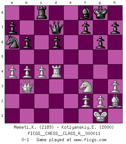 Last move : 0-1 2007 April 20 23:54:24 [Event "FICGS__CHESS__CLASS_A__000011"] [Site "FICGS"] [Date "2006.12.25"] [Round "1"] [White "Memeti,Kastriot"] [Black "Kotlyanskiy,Edward"] [Result "0-1"] [WhiteElo "2189"] [BlackElo "2000"] 1.d4 Nf6 2.Nf3 g6 3.Bf4 Bg7 4.e3 d6 5.h3 O-O 6.Be2 c5 7.c3 b6 8.O-O Bb7 9.a4 Nc6 10.Nbd2 cxd4 11.exd4 Qc7 12.Bh2 Bh6 13.Re1 Nd8 14.c4 Ne6 15.d5 Nc5 16.b4 Na6 17.Qb3 Rfe8 18.Rad1 Qc8 19.Bd3 e5 20.dxe6 Rxe6 21.Rxe6 Qxe6 22.Re1 Qd7 23.Ne4 Bxe4 24.Bxe4 Nxe4 25.Rxe4 Bf8 26.Rd4 Rc8 0-1 King's Indian : London system Kingside Castling by player Black (move 5) Kingside Castling by player White (move 8) Player Black won this chess game. Follow this game move after move (download)When you see a good move, look for a better one. (Emanuel Lasker) Versuche, dich von der Sklaverei der Eröffnungsvarianten zu befreien. Stattdessen soll man gewisse Typenpositionen erlernen, die man eingehend analysiert. (Aaron Nimzowitsch) En el Ajedrez, tal como en la vida, las bendiciones de hoy pueden ser el veneno del mañana. (Assaic) Les réformistes prétendent que les progrès de la théorie conduiront à la disparition des échecs, et qu'il faut, pour leur rendre vie, en remanier les règles. En réalité, qu'exprime cette affirmation? Le mépris de l'intuition, de l'imagination et de tous les autres éléments qui font des échecs un art. (Alexander Alekhine) Beep ! (R2D2 in Star Wars ep.3)