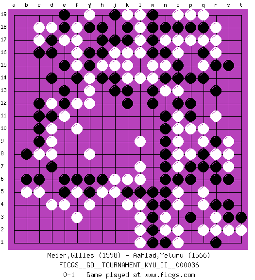 Last move : 0-1 2011 December 1 15:18:21 [Event "FICGS__GO__TOURNAMENT_KYU_II__000036"] [Site "FICGS"] [Date "2011.06.23"] [Round "1"] [Black "Meier,Gilles"] [White "Aahlad,Yeturu"] [Result "0-1"] [Rating 1 "1598"] [Rating 2 "1566"] 1.q16 d4 2.d16 q4 3.c6 f3 4.c10 f17 5.h17 f15 6.d14 j16 7.j17 k16 8.k17 l16 9.h16 h15 10.m17 n15 11.r6 r8 12.p6 o4 13.n6 r11 14.r13 o7 15.o6 l3 16.p7 n17 17.m16 m15 18.n16 l17 19.m18 l18 20.g16 f16 21.g15 g14 22.h14 j15 23.f14 g13 24.k18 k19 25.j19 l19 26.g18 f18 27.h18 g19 28.e15 o16 29.n18 o17 30.o18 p17 31.p18 q17 32.q18 r17 33.l15 r18 34.j14 l14 35.m19 k15 36.o15 q15 37.o14 k14 38.j13 g12 39.k12 q19 40.n14 m14 41.m13 p19 42.r15 n13 43.m12 o13 44.p14 o11 45.q14 r16 46.s15 l9 47.n11 o10 48.n10 o8 49.o12 p8 50.p11 l6 51.s4 s7 52.s6 r3 53.s3 s2 54.r4 q2 55.r7 s8 56.q8 q9 57.q7 q5 58.p9 p10 59.r9 q10 60.p12 s9 61.n4 n3 62.m4 l4 63.m3 n2 64.m2 l2 65.n8 l7 66.n7 o9 67.n9 c17 68.d17 d18 69.e18 c18 70.e19 e17 71.c16 b5 72.b6 c5 73.e6 f5 74.f6 h5 75.n1 o2 76.p3 o5 77.n5 o1 78.m1 l1 79.r1 t2 80.t3 r2 81.k13 o19 82.e5 e4 83.g5 g4 84.g6 d12 85.c12 e11 86.d11 d10 87.c11 f10 88.e12 f12 89.e13 d9 90.c9 d8 91.d7 c8 92.b8 g8 93.h6 j5 94.k5 k4 95.l5 k6 96.m5 j6 0-1 Here are the names of the openings (joseki) played in the four corners : Corner d4 : d4 c6 Hoshi (Hwajeom, Seongjeom, Xingwei`) 4-4 Point. The star or hoshi (4-4) point, emphasizing influence at the potential expense of territory. Ikken Kakari (Hankan Keolch'im, Yi Gua`jiao~, 1-Space Low Approach). Black 2 is the standard approach move to the 4-4. Corner d16 : d16 f17 Hoshi (Hwajeom, Seongjeom, Xingwei`) 4-4 Point. The star or hoshi (4-4) point, emphasizing influence at the potential expense of territory. Ikken Kakari (Hankan Keolch'im, Yi Gua`jiao~, 1-Space Low Approach). White 2 is the standard approach move to the 4-4. Corner q16 : q16 l16 Hoshi (Hwajeom, Seongjeom, Xingwei`) 4-4 Point. The star or hoshi (4-4) point, emphasizing influence at the potential expense of territory. Corner q4 : q4 r6 Hoshi (Hwajeom, Seongjeom, Xingwei`) 4-4 Point. The star or hoshi (4-4) point, emphasizing influence at the potential expense of territory. Ikken Kakari (Hankan Keolch'im, Yi Gua`jiao~, 1-Space Low Approach). Black 2 is the standard approach move to the 4-4. Player White won this Go (weiqi, baduk) game. Follow this game move after move (download)Go is to western chess what philosophy is to double entry accounting. (from Shibumi, by Trevanian) Humor is by far the most significant activity of the human brain. (Edward De Bono)