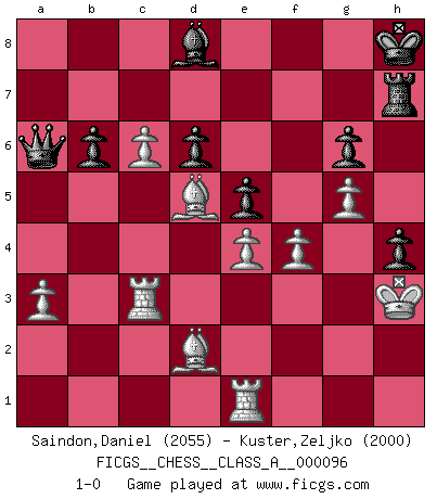 Last move : 1-0 2011 November 21 8:9:20 [Event "FICGS__CHESS__CLASS_A__000096"] [Site "FICGS"] [Date "2011.06.24"] [Round "1"] [White "Saindon,Daniel"] [Black "Kuster,Zeljko"] [Result "1-0"] [WhiteElo "2055"] [BlackElo "2000"] 1.d4 Nf6 2.c4 g6 3.Nc3 Bg7 4.e4 d6 5.Be2 O-O 6.Bg5 Na6 7.Qd2 e5 8.d5 c6 9.f3 cxd5 10.cxd5 Bd7 11.g4 h6 12.Be3 h5 13.g5 Ne8 14.h4 Nec7 15.Nh3 Nc5 16.Nf2 a5 17.Nd3 b6 18.b3 f6 19.Nb2 fxg5 20.hxg5 N7a6 21.Nc4 Be8 22.Na3 Rf7 23.Rb1 Bf8 24.O-O Bd7 25.Kh2 h4 26.Nab5 Nc7 27.Nxc7 Qxc7 28.a3 a4 29.Nxa4 Bxa4 30.bxa4 Rxa4 31.Qb2 Qc8 32.Rbc1 Qd8 33.Rg1 R4a7 34.Rg4 Qa8 35.Ra1 Rh7 36.Kg2 Na4 37.Qd2 Nc5 38.Qc3 Be7 39.Qb2 Bf8 40.Kh3 Qc8 41.Qb4 Ra4 42.Qb5 R4a7 43.Bd1 Na4 44.Rc1 Nc3 45.Qc6 Rac7 46.Rxc3 Rxc6 47.dxc6 Qa6 48.Bb3+ Kh8 49.Rg1 Rc7 50.Bd5 Be7 51.Re1 Bd8 52.f4 Rh7 53.Bd2 1-0 King's Indian : Averbakh system Kingside Castling by player Black (move 5) Kingside Castling by player White (move 24) Player White won this chess game. Follow this game move after move (download)The stomach is an essential part of the Chess master. (Bent Larsen) Drei Punkte vor allen anderen ist wie einer, der im weißen Anzug posiert, während der Rest in Müllsäcke gekleidet dasteht. (Viktor Kortschnoi) ¿Se han dado cuenta de que Fischer casi nunca ha tenido piezas malas? El las intercambia y las piezas malas se quedan con sus oponenets. (Yuri Balashov) Le plus grand jeu de l'esprit jamais inventé, plus vous l'apprenez, plus vous y prenez du plaisir. (Garry Kasparov) The greatest con, that he ever pulled... was making you believe... that he is you. (Revolver, movie)