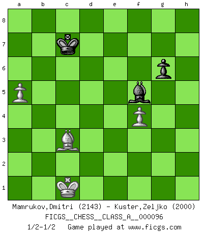 Last move : 1/2-1/2 2011 July 13 22:13:54 [Event "FICGS__CHESS__CLASS_A__000096"] [Site "FICGS"] [Date "2011.06.24"] [Round "1"] [White "Mamrukov,Dmitri"] [Black "Kuster,Zeljko"] [Result "1/2-1/2"] [WhiteElo "2143"] [BlackElo "2000"] 1.d4 Nf6 2.c4 e6 3.Nf3 b6 4.e3 Bb7 5.Bd3 Be7 6.O-O O-O 7.Nc3 d5 8.cxd5 exd5 9.b3 c5 10.Bb2 Nc6 11.dxc5 bxc5 12.Rc1 Nb4 13.Bb1 Rc8 14.a3 Na6 15.Bf5 Rb8 16.Na4 g6 17.Bd3 Nd7 18.Bb5 Nb6 19.Qd3 Nxa4 20.Bxa4 f6 21.Rfd1 Bd6 22.e4 c4 23.Qe3 Nc5 24.exd5 Ba6 25.Bd4 Nxa4 26.Qe6+ Rf7 27.bxa4 Bb7 28.Rb1 Qd7 29.Bxf6 Re8 30.Qxd7 Rxd7 31.h3 Rc8 32.Bc3 Bxa3 33.Rb5 Bd6 34.Ng5 Be7 35.Ne4 a6 36.Rb6 Rxd5 37.Rxd5 Bxd5 38.Rxa6 Bxe4 39.Re6 Bxg2 40.Rxe7 Bxh3 41.a5 Rc6 42.Rg7+ Kf8 43.Rxh7 Bf5 44.Kf1 Ke8 45.Ke2 Kd8 46.Kd2 Rd6+ 47.Kc1 Rd7 48.Rh4 Kc8 49.Rxc4+ Rc7 50.Rxc7+ Kxc7 51.f4 1/2-1/2 Queen's Indian : 4.e3 Kingside Castling by player White (move 6) Kingside Castling by player Black (move 6) 10 pieces endgame at move 43 : White KRBPP , Black KRBPP WHITE : King + 1 Rook 1 Bishop 2 Pawns BLACK : King + 1 Rook 1 Bishop 2 Pawns 9 pieces endgame at move 49 : White KRBPP , Black KRBP WHITE : King + 1 Rook 1 Bishop 2 Pawns BLACK : King + 1 Rook 1 Bishop 1 Pawn 8 pieces endgame at move 50 : White KRBPP , Black KBP WHITE : King + 1 Rook 1 Bishop 2 Pawns BLACK : King + 1 Bishop 1 Pawn 7 pieces endgame at move 50 : White KBPP , Black KBP WHITE : King + 1 Bishop 2 Pawns BLACK : King + 1 Bishop 1 Pawn This chess game ended in a draw. Follow this game move after move (download)Chess is a part of culture and if a culture is declining then Chess too will decline. (Mikhail Botvinnik) Das Schachspiel hat wie die Liebe, die Musik, die Fähigkeit, den Menschen glücklich zu machen. Ich habe ein leises Gefühl des Bedauerns für jeden, der das Schachspiel nicht kennt, so wie ich jeden bedaure, der die Liebe nicht kennt. (Siegbert Tarrasch) Ser exitoso en el Ajedrez te permite descubrir tu propia personalidad. Eso es lo que deseo para los niños de mi clase. (Saudin Robovic) Les échecs sont utiles à l'exercice de la faculté de penser et à celle de l'imagination. Car nous devons posséder une méthode élaborée pour atteindre des buts partout où nous devons conduire notre raison. (Leibnitz) Nobody is always a winner, and anybody who says he is, is either a liar or doesn't play poker. (Amarillo Slim)