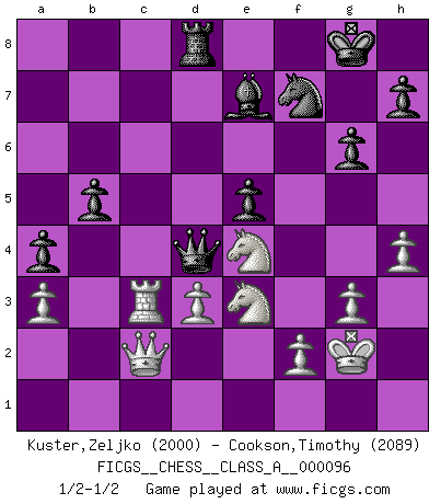 Last move : 1/2-1/2 2011 July 27 11:46:22 [Event "FICGS__CHESS__CLASS_A__000096"] [Site "FICGS"] [Date "2011.06.24"] [Round "1"] [White "Kuster,Zeljko"] [Black "Cookson,Timothy"] [Result "1/2-1/2"] [WhiteElo "2000"] [BlackElo "2089"] 1.c4 e5 2.g3 Nf6 3.Bg2 d5 4.cxd5 Nxd5 5.Nf3 Nc6 6.O-O Nb6 7.Nc3 Be7 8.a3 O-O 9.b4 Be6 10.Rb1 f6 11.d3 a5 12.b5 Nd4 13.Nd2 Qc8 14.e3 Nf5 15.Bb2 Rd8 16.Qc2 Nd6 17.Nb3 Nf7 18.Ne4 f5 19.Nec5 Bd5 20.e4 fxe4 21.Nxe4 c6 22.bxc6 Bxc6 23.Rfc1 Na4 24.Qe2 Nxb2 25.Qxb2 Qf5 26.Rc3 a4 27.Nbd2 Ra5 28.Qc2 Qd7 29.Nc4 Rb5 30.Rxb5 Bxb5 31.h4 Qd4 32.Qb2 Bc6 33.Ne3 g6 34.Nd2 Bxg2 35.Kxg2 b5 36.Qc2 Kg7 37.Ne4 Kg8 1/2-1/2 English Opening Kingside Castling by player White (move 6) Kingside Castling by player Black (move 8) This chess game ended in a draw. Follow this game move after move (download)If Chess is a science, it's a most inexact one. If Chess is an art, it is too exacting to be seen as one. If Chess is a sport, it's too esoteric. If Chess is a game, it's too demanding to be just a game. If Chess is a mistress, she's a demanding one. If Chess is a passion, it's a rewarding one. If Chess is life, it's a sad one. (Unknown) Der Freibauer hat für mich eine Seele, genau wie der Mensch, Wünsche, die unerkannt in ihm schlummern, und Befürchtungen, von deren Existenz er selbst kaum ahnt. (Aaron Nimzowitsch) Todos los jugadores de Ajedrez deberían tener un pasatiempo. (Savielly Tartakower) Une platitude souvent récitée à propos des Echecs est qu'une des choses les plus difficiles à réaliser est de gagner une position gagnante. Cela ne manque pas de sens mais, pour ma part, j'ai toujours trouvé plus difficile de gagner une position perdante. (Tim Krabbe) The only thing that overcomes hard luck is hard work. (Harry Golden)
