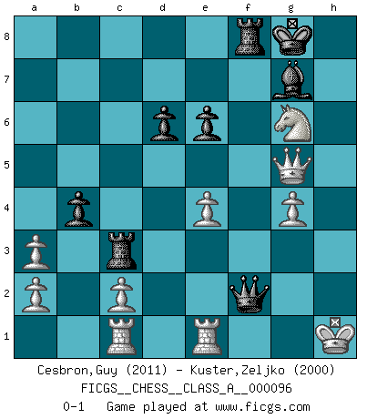 Last move : 0-1 2011 September 16 19:17:10 [Event "FICGS__CHESS__CLASS_A__000096"] [Site "FICGS"] [Date "2011.06.24"] [Round "1"] [White "Cesbron,Guy"] [Black "Kuster,Zeljko"] [Result "0-1"] [WhiteElo "2011"] [BlackElo "2000"] 1.e4 c5 2.Nf3 Nc6 3.d4 cxd4 4.Nxd4 g6 5.Nc3 Bg7 6.Be3 Nf6 7.Bc4 O-O 8.Bb3 d6 9.f3 Bd7 10.Qd2 Nxd4 11.Bxd4 b5 12.h4 a5 13.h5 a4 14.Bd5 b4 15.Bxf6 exf6 16.Ne2 Rc8 17.hxg6 hxg6 18.g4 Be6 19.Nf4 Re8 20.Bxe6 fxe6 21.Nxg6 Qc7 22.Rc1 f5 23.Qg5 fxe4 24.fxe4 a3 25.bxa3 Qc3+ 26.Ke2 Qc4+ 27.Kf3 Qd4 28.Rhe1 Rf8+ 29.Kg2 Qf2+ 30.Kh1 Rc3 0-1 Sicilian : Accelerated Fianchetto, Modern variation with Bc4 Kingside Castling by player Black (move 7) Player Black won this chess game. Follow this game move after move (download)The King is a fighting piece. Use it ! (Wilhelm Steinitz) Intelligenz läßt sich nicht am Weg, sondern nur am Ergebnis feststellen. (Garry Kasparov) Una compensación adecuada por un sacrificio es tener una combinación sólida que conduce a una posición ganadora; una compensación adecuada por una metida de pata es dejar a tu oponente arrebatar una derrota de las fauces de la victoria. (Bruce A. Moon) La tactique est l'élément le plus important du milieu de jeu. (Siegbert Tarrasch) I don't know, I don't care, and it doesn't make any difference. (Albert Einstein)