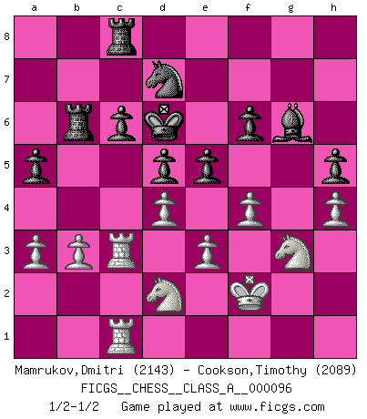 Last move : 1/2-1/2 2011 July 3 1:50:53 [Event "FICGS__CHESS__CLASS_A__000096"] [Site "FICGS"] [Date "2011.06.24"] [Round "1"] [White "Mamrukov,Dmitri"] [Black "Cookson,Timothy"] [Result "1/2-1/2"] [WhiteElo "2143"] [BlackElo "2089"] 1.d4 d5 2.c4 c6 3.Nf3 Nf6 4.e3 Bf5 5.cxd5 cxd5 6.Qb3 Qc7 7.Bd2 Nc6 8.Bb5 e6 9.O-O Bd6 10.Bb4 O-O 11.Bxc6 bxc6 12.Bxd6 Qxd6 13.Qa3 Qxa3 14.Nxa3 Nd7 15.Rfc1 Rab8 16.b3 Rfc8 17.Rc3 h5 18.Rac1 Rb6 19.Nb1 f6 20.Nbd2 g5 21.a3 a5 22.h4 g4 23.Nh2 e5 24.Nhf1 Bg6 25.Ng3 Kf7 26.Ne2 Ke6 27.f3 gxf3 28.gxf3 Kd6 29.Kf2 Rg8 30.Ng3 Rgb8 31.f4 Rc8 1/2-1/2 QGD Slav : 4.e3 Bf5 Kingside Castling by player White (move 9) Kingside Castling by player Black (move 10) This chess game ended in a draw. Follow this game move after move (download)Man is a frivolous, a specious creature, and like a Chess player, cares more for the process of attaining his goal than for the goal itself. (Dostoyevsky) Sehr viele beherrschen heutzutage das große Einmalseins des Schachspiels und kennen sogar dessen Logarithmentafeln auswendig - deshalb sollte man hin und wieder zu beweisen trachten, dass zwei mal zwei auch fünf sein kann. (Mikhail Nekhemyevich Tal) Ser exitoso en el Ajedrez te permite descubrir tu propia personalidad. Eso es lo que deseo para los niños de mi clase. (Saudin Robovic) A ce moment-là, je menaçais de comprendre la position ! (Clément L'Heureux) A government big enough to give you everything you want is strong enough to take everything you have. (Thomas Jefferson)