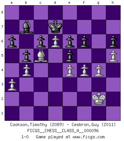 Last move : 1-0 2012 April 18 0:53:55 [Event "FICGS__CHESS__CLASS_A__000096"] [Site "FICGS"] [Date "2011.06.24"] [Round "1"] [White "Cookson,Timothy"] [Black "Cesbron,Guy"] [Result "1-0"] [WhiteElo "2089"] [BlackElo "2011"] 1.d4 Nf6 2.c4 d6 3.Nf3 Nbd7 4.Nc3 e5 5.e4 c6 6.Be2 Be7 7.O-O O-O 8.Re1 a6 9.Bf1 b5 10.a3 Re8 11.Be3 Bb7 12.h3 h6 13.Qc2 Rc8 14.Rad1 Qc7 15.dxe5 Nxe5 16.Nxe5 dxe5 17.Ne2 Nh5 18.Nc1 Nf4 19.b4 Ne6 20.Nb3 Red8 21.Rc1 Rd7 22.Qb2 Qb8 23.Be2 Rcd8 24.Bg4 Rd3 25.Bb6 R8d6 26.c5 Rd7 27.Bxe6 fxe6 28.Qc2 Qe8 29.Red1 Rxd1+ 30.Rxd1 Bc8 31.Qe2 Kh7 32.Nd2 Qg6 33.Re1 Bf6 34.Nf3 Kg8 35.Qc2 Kh7 36.Ra1 Kg8 37.g3 Kh7 38.Re1 Kg8 39.Kg2 Kh7 40.Re3 Kg8 41.Qb3 Qf7 42.Rd3 Qe7 43.h4 Kf7 44.Qd1 Rxd3 45.Qxd3 Ke8 46.h5 Qd7 47.Qe2 Qf7 48.Nh2 Kf8 49.Qd3 Qd7 50.Qf3 Qf7 51.Ng4 Ke8 52.Qd3 Qd7 53.Qd6 Qxd6 54.cxd6 Kd7 55.Bc5 Bb7 56.Nxf6+ gxf6 57.g4 Bc8 58.f3 Bb7 59.f4 1-0 Old Indian defense Kingside Castling by player White (move 7) Kingside Castling by player Black (move 7) Player White won this chess game. Follow this game move after move (download)I won't play with you anymore. You have insulted my friend. - When an opponent cursed himself for a blunder. (Miguel Najdorf) Karpov ist ein Museumsstück. (Garry Kasparov) El tablero es el mundo, las piezas es el fenomeno del universo, las reglas del juego son lo que llamamos leyes de la naturaleza y el jugador del lado opuesto, se encuentra oculto a nuestra vista. (Thomas Huxley) Les échecs sont un jeu terrible. Si vous n'avez pas le centre, votre adversaire a une position plus libre. Par contre, si vous avez le centre, alors vous avez vraiment quelque chose pour laquelle vous inquiéter ! (Siegbert Tarrasch) For peace of mind, resign as general manager of the universe. (Douglas Adams)
