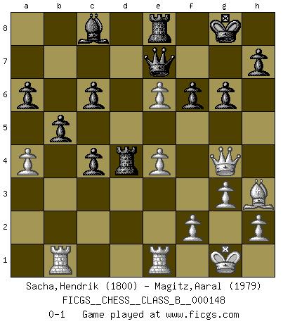 Last move : 0-1 2011 September 29 23:11:57 [Event "FICGS__CHESS__CLASS_B__000148"] [Site "FICGS"] [Date "2011.06.24"] [Round "1"] [White "Sacha,Hendrik"] [Black "Magitz,Aaral"] [Result "0-1"] [WhiteElo "1800"] [BlackElo "1979"] 1.d4 d5 2.c4 dxc4 3.Nc3 c6 4.Nf3 b5 5.g3 Nf6 6.Bg2 e6 7.Ne5 Nd5 8.O-O Bb7 9.e4 Nxc3 10.bxc3 Nd7 11.Bf4 Nxe5 12.Bxe5 f6 13.Bf4 Ba3 14.Qh5+ g6 15.Qg4 Bb2 16.Rab1 Bxc3 17.d5 Qe7 18.dxe6 Rd8 19.Rfc1 Bd4 20.a4 a6 21.Bh3 O-O 22.Re1 Bc8 23.Be3 Rfe8 24.Bxd4 Rxd4 0-1 Queen's gambit accepted Kingside Castling by player White (move 8) Kingside Castling by player Black (move 21) Player Black won this chess game. Follow this game move after move (download)Chess is a terrific way for kids to build self image and self esteem. (Saudin Robovic) Ich verstehe Aljechins Kombinationen ganz gut; aber woher er diese Angriffschancen bekommt und wie er die Eröffnung behandelt das ist für mich ein Buch mit sieben Siegeln. (Rudolf Spielmann) No solamente yo pronostico su triunfo sobre Botvinnik, sino que me adelanto y digo que probablemente Fischer es el jugador de Ajedrez mas grande que haya existido. (John Collins) Il n'y a pas eu de défaite parce que je ne crois pas que cet ordinateur ait jamais existé. IBM a triché en refusant d'imprimer les modes de recherche de la machine. C'est évident, pendant le match, des coups décisifs ont été joués par des êtres humains. Aujourd'hui, les meilleurs spécialistes en informatique ne peuvent toujours pas expliquer comment Deep-Blue a pu jouer contre la logique des ordinateurs. IBM a gagné une guerre de communication, mais ils sont incapables de prouver que l'ordinateur a gagné tout seul. (Garry Kasparov) Shallow men believe in luck. Strong men belive in cause and effect. (Ralph Waldo Emerson)