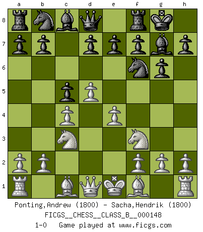 Last move : 1-0 2011 September 6 10:22:26 [Event "FICGS__CHESS__CLASS_B__000148"] [Site "FICGS"] [Date "2011.06.24"] [Round "1"] [White "Ponting,Andrew"] [Black "Sacha,Hendrik"] [Result "1-0"] [WhiteElo "1800"] [BlackElo "1800"] 1.c4 Nf6 2.d4 g6 3.Nf3 Bg7 4.Nc3 c5 5.d5 O-O 6.e4 1-0 This chess game has been lost on time (started : 2011.06.24 9:37:18) English, 1...Nf6 (Anglo-Indian defense) Kingside Castling by player Black (move 5) Player White won this chess game. Follow this game move after move (download)The essence of Chess is thinking about what Chess is. (David Bronstein) Schach ist ein Kampf gegen den Fehler. (Johannes Herrman Zukertort) La partida mas dura de ganar es una partida ganada. (Emanuel Lasker) Avant la finale, les dieux ont créé le milieu de partie. (Tarrasch) The worth of a book is to be measured by what you can carry away from it. (James Bryce)