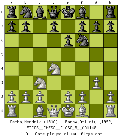 Last move : 1-0 2011 August 6 9:19:38 [Event "FICGS__CHESS__CLASS_B__000148"] [Site "FICGS"] [Date "2011.06.24"] [Round "1"] [White "Sacha,Hendrik"] [Black "Panov,Dmitriy"] [Result "1-0"] [WhiteElo "1800"] [BlackElo "1992"] 1.d4 Nf6 2.Nc3 e6 3.g3 c5 4.Nf3 cxd4 5.Nxd4 1-0 This chess game has been lost on time (started : 2011.06.24 9:37:18) Queen's pawn game Player White won this chess game. Follow this game move after move (download)Pawns: they are the soul of this game, they alone form the attack and defense. (Philidor) Die Arbeit ist etwas Unnatürliches. Die Faulheit allein ist göttlich. (Anatole France) El Ajedrez es parte de una cultura y si una cultura esta en decadencia, entonces también el Ajedrez declinará. (Mikhail Botvinnik) La tactique est l'élément le plus important du milieu de jeu. (Siegbert Tarrasch) I don't know, I don't care, and it doesn't make any difference. (Albert Einstein)