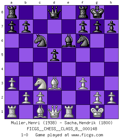 Last move : 1-0 2011 September 28 11:5:22 [Event "FICGS__CHESS__CLASS_B__000148"] [Site "FICGS"] [Date "2011.06.24"] [Round "1"] [White "Muller,Henri"] [Black "Sacha,Hendrik"] [Result "1-0"] [WhiteElo "1938"] [BlackElo "1800"] 1.e4 c5 2.Nf3 Nc6 3.d4 cxd4 4.Nxd4 e6 5.Nc3 Nf6 6.Ndb5 Bb4 7.a3 Bxc3+ 8.Nxc3 d5 9.exd5 exd5 10.Bd3 Bg4 11.f3 Be6 12.O-O O-O 13.Re1 1-0 Sicilian defense Kingside Castling by player White (move 12) Kingside Castling by player Black (move 12) Player White won this chess game. Follow this game move after move (download)There is only one thing Fischer does in Chess without pleasure: to lose ! (Boris Spassky) Zu meiner Zeit war ein 20 jähriger ein junger Spieler, heute ist er ein Veteran. (Garry Kasparov) Las Aperturas te enseñan aperturas. ¡Los Finales te enseñan Ajedrez!. (Stephan Gerzadowicz) Les Echecs ont trois composantes : le temps, l'espace et le matériel en dernier. (Mikhail Tal) Beta. Software undergoes beta testing shortly before it's released. Beta is latin for still doesn't work. (Anonymous)