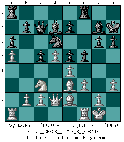 Last move : 0-1 2011 October 14 11:52:8 [Event "FICGS__CHESS__CLASS_B__000148"] [Site "FICGS"] [Date "2011.06.24"] [Round "1"] [White "Magitz,Aaral"] [Black "van Dijk,Erik L."] [Result "0-1"] [WhiteElo "1979"] [BlackElo "1965"] 1.d4 c5 2.d5 d6 3.e4 Nf6 4.Nc3 a6 5.a4 g6 6.Bd3 Bg7 7.Nf3 O-O 8.O-O Qc7 9.h3 Nbd7 10.Bc4 Ne5 11.Nxe5 dxe5 12.a5 Bd7 13.Bg5 h6 14.Be3 Ne8 15.Be2 Nd6 16.Qd2 Kh7 17.f3 f5 0-1 Old Benoni defense Kingside Castling by player Black (move 7) Kingside Castling by player White (move 8) Player Black won this chess game. Follow this game move after move (download)It began to feel as though you were playing against Chess itself. - On playing against Robert Fischer. (Walter Shipman) Ich habe die Schachforschung dermaßen betrieben, dass sie auf eine wissenschaftliche Basis gestellt wurde. (Mikhail Moiseyevich Botvinik) Solo el jugador con la iniciativa tiene el derecho a atacar. (Wilhelm Steinitz) La solitude du joueur d'Echecs à l'approche du mat est semblable à celle du condamné. (Francis Szpiner) O divine art of subtlety and secrecy! Through you we learn to be invisible, through you inaudible and hence we can hold the enemy's fate in our hands. (Sun Tzu)
