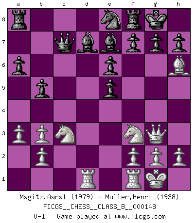 Last move : 0-1 2011 October 7 23:41:9 [Event "FICGS__CHESS__CLASS_B__000148"] [Site "FICGS"] [Date "2011.06.24"] [Round "1"] [White "Magitz,Aaral"] [Black "Muller,Henri"] [Result "0-1"] [WhiteElo "1979"] [BlackElo "1938"] 1.e4 c5 2.Nf3 d6 3.Bc4 Nf6 4.Nc3 e6 5.d4 cxd4 6.Nxd4 a6 7.O-O b5 8.Bb3 Be7 9.Qf3 Qc7 10.Qg3 O-O 11.Bh6 Ne8 12.Rad1 Bd7 13.a3 Nc6 14.Nf3 Na5 15.e5 Nxb3 16.cxb3 dxe5 0-1 Sicilian Kingside Castling by player White (move 7) Kingside Castling by player Black (move 10) Player Black won this chess game. Follow this game move after move (download)Half the variations which are calculated in a tournament game turn out to be completely superfluous. Unfortunately, no one knows in advance which half. (Jan Tinman) Der 70jährige Viktor Kortschnoi: Die Rentenanstalt wollte mich zwingen in Rente zu gehen. Meine Frau erhält jetzt eine Pension- und ich zahle weiter in die Rentenkasse ein! (Viktor Kortschnoi) En un gambito tu regalas un Peón por el bién de tomar un juego perdido. (Samuel Standige Boden) Les échecs sont un jeu par leur forme, un art par leur essence et une science par sa difficulté d'acquisition. Ils peuvent vous procurer autant de plaisir qu'un bon livre ou une belle musique, mais vous n'aurez une réelle joie que si vous arrivez à bien jouer. (Tigran Petrosian) Every vice is only an exaggeration of a necessary and virtuous function. (Ralph Waldo Emerson, Journals 1936)