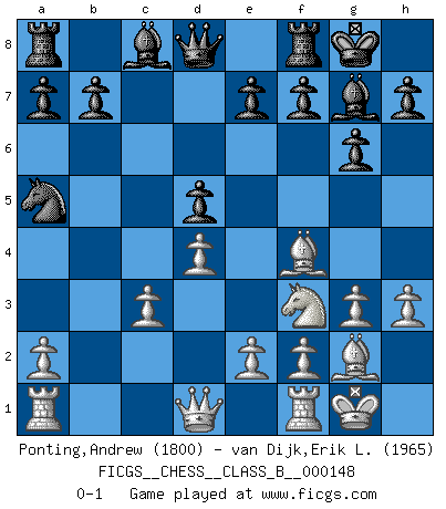Last move : 0-1 2011 September 26 22:57:57 [Event "FICGS__CHESS__CLASS_B__000148"] [Site "FICGS"] [Date "2011.06.24"] [Round "1"] [White "Ponting,Andrew"] [Black "van Dijk,Erik L."] [Result "0-1"] [WhiteElo "1800"] [BlackElo "1965"] 1.d4 Nf6 2.Nf3 g6 3.c4 Bg7 4.g3 O-O 5.Bg2 c6 6.O-O d5 7.cxd5 cxd5 8.Nc3 Nc6 9.h3 Ne4 10.Bf4 Nxc3 11.bxc3 Na5 0-1 This chess game has been lost on time (started : 2011.06.24 9:37:18) King's Indian : East Indian defense Kingside Castling by player Black (move 4) Kingside Castling by player White (move 6) Player Black won this chess game. Follow this game move after move (download)The boy (then a 12 year old boy named Anatoly Karpov) doesn't have a clue about Chess, and there's no future at all for him in this profession. (Mikhail Botvinnik) Ihnen, Herr Lasker, habe ich nur drei Worte zu sagen: Schach und matt. (Siegbert Tarrasch) Los errores estan ahí, esperando a que se cometan. (Savielly Tartakower) On n'a jamais que l'âge auquel on a commence à jouer aux échecs car après on cesse de vieillir. (Capablanca) Perseverance does not equal worthiness. Next time you want to get my attention, wear something fun. Low-riding jeans are hot. (Gregory House, House M.D.)