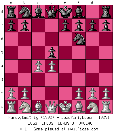 Last move : 0-1 2011 August 7 21:26:47 [Event "FICGS__CHESS__CLASS_B__000148"] [Site "FICGS"] [Date "2011.06.24"] [Round "1"] [White "Panov,Dmitriy"] [Black "Jozefini,Lubor"] [Result "0-1"] [WhiteElo "1992"] [BlackElo "1929"] 1.e4 c6 2.d4 d5 3.exd5 cxd5 4.c4 Nf6 0-1 This chess game has been lost on time (started : 2011.06.24 9:37:18) Caro-Kann : Panov-Botvinnik attack Player Black won this chess game. Follow this game move after move (download)When I asked Fischer why he had not played a certain move in our game, he replied: 'Well, you laughed when I wrote it down !' (Mikhail Tal) Korrekt heißt in Deutschland die Haltung eines Mannes, dessen Benehmen nach dem Urteile seiner Nachbarn seiner Stellung angemessen ist. Um korrekt zu sein, muß man sich der Meinung der anderen anpassen... (Emanuel Lasker) Los tropiezos estan todos ahí en el tablero, esperando que se cometan. (Savielly Tartakover) L'action d'une oeuvre littéraire se déroule sur un champ de bataille. Les masques et les types du drame moderne correspondent aux pièces du jeu d'échecs. L'intrigue correspond aux coups et aux gambits, c'est à dire aux techniques du jeu telles qu'utilisées et interprétées par les joueurs. Les tactiques et les péripéties [mouvements] correspondent aux coups exécutés par l'adversaire. (Viktor Shklovsky) When you stop learning you start dying. (M. Scott Adams)
