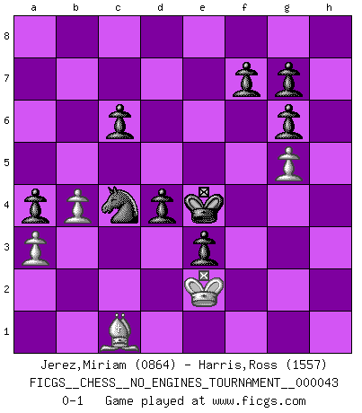 Last move : 0-1 2011 September 27 3:12:34 [Event "FICGS__CHESS__NO_ENGINES_TOURNAMENT__000043"] [Site "FICGS"] [Date "2011.06.25"] [Round "1"] [White "Jerez,Miriam"] [Black "Harris,Ross"] [Result "0-1"] [WhiteElo "0864"] [BlackElo "1557"] 1.e4 c6 2.d4 d5 3.e5 Bf5 4.Nf3 e6 5.Nc3 c5 6.Bb5+ Nc6 7.O-O a6 8.Bxc6+ bxc6 9.Re1 c4 10.h3 Bb4 11.Bd2 Ne7 12.a3 Bxc3 13.Bxc3 a5 14.b3 cxb3 15.cxb3 Qb6 16.b4 a4 17.Ra2 Qa6 18.Qe2 Qxe2 19.R1xe2 Nc8 20.Nh4 Bd3 21.Re3 Bg6 22.Nxg6 hxg6 23.f4 Na7 24.g4 Nb5 25.Ba1 Kd7 26.Kg2 Rh4 27.Kg3 Rah8 28.Kg2 Rf8 29.g5 Rxf4 30.Kg3 Rf1 31.Rf3 Rd1 32.Bb2 Nxd4 33.Rf2 Nf5+ 34.Kh2 Rh8 35.Ra1 Rd3 36.Kg2 R8xh3 37.Rh1 Rxh1 38.Kxh1 Rh3+ 39.Rh2 Rxh2+ 40.Kxh2 Ne3 41.Kg3 Nc4 42.Bc1 Nxe5 43.Bb2 Nc4 44.Bc1 e5 45.Kf3 Ke6 46.Kg4 d4 47.Kf3 Kf5 48.Ke2 e4 49.Ke1 e3 50.Ke2 Ke4 0-1 Caro-Kann : Advance variation Kingside Castling by player White (move 7) Player Black won this chess game. Follow this game move after move (download)No price is too great for the scalp of the enemy King. (Koblentz) Der Partner hat auch seine Existenzberechtigung. (Savielly Grigorievitsch Tartakower) Los finales de Peón son del Ajedrez lo que el cesped es del Golf. (Cecil Purdy) Je menace de comprendre la position. (Anonyme) In every real man a child is hidden that wants to play. (Friedrich Nietzsche)