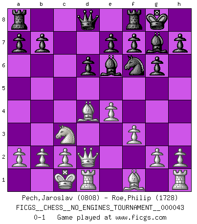 Last move : 0-1 2011 October 2 11:21:48 [Event "FICGS__CHESS__NO_ENGINES_TOURNAMENT__000043"] [Site "FICGS"] [Date "2011.06.25"] [Round "1"] [White "Pech,Jaroslav"] [Black "Roe,Philip"] [Result "0-1"] [WhiteElo "0808"] [BlackElo "1728"] 1.e4 c5 2.Nf3 d6 3.d4 cxd4 4.Nxd4 Nf6 5.Nc3 g6 6.Be3 Bg7 7.f3 Nc6 8.Qd2 O-O 9.O-O-O Nxd4 10.Bxd4 Be6 0-1 This chess game has been lost on time (started : 2011.06.25 4:19:56) Sicilian : Dragon, Yugoslav attack Kingside Castling by player Black (move 8) Queenside Castling by player White (move 9) Player Black won this chess game. Follow this game move after move (download)Chess teaches you to control the initial excitement you feel when you see something that looks good and it trains you to think objectively when you're in trouble. (Stanley Kubrick) Ohne ihre Erfolge schmälern zu wollen würde ich sagen Petrosian, Spassky und Karpov verdanken ihre Siege ihren Trainern - Boleslavsky, Bondarevsky und Furman. (Mikhail Moiseyevich Botvinik) Tu cuerpo tiene que estar en óptima condición. Tu Ajedrez se deteriora como lo hace tu cuerpo. No puedes separar la mente y el cuerpo. (Bobby Fischer) L'action d'une oeuvre littéraire se déroule sur un champ de bataille. Les masques et les types du drame moderne correspondent aux pièces du jeu d'échecs. L'intrigue correspond aux coups et aux gambits, c'est à dire aux techniques du jeu telles qu'utilisées et interprétées par les joueurs. Les tactiques et les péripéties [mouvements] correspondent aux coups exécutés par l'adversaire. (Viktor Shklovsky) It's not the will to win, but the will to prepare to win that makes the difference. (Bear Bryant)