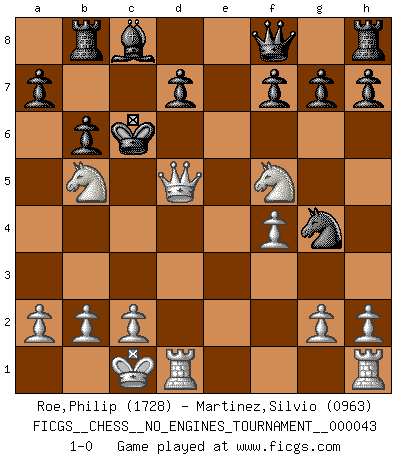 Last move : 1-0 2011 August 19 1:17:15 [Event "FICGS__CHESS__NO_ENGINES_TOURNAMENT__000043"] [Site "FICGS"] [Date "2011.06.25"] [Round "1"] [White "Roe,Philip"] [Black "Martinez,Silvio"] [Result "1-0"] [WhiteElo "1728"] [BlackElo "0963"] 1.e4 Nc6 2.d4 e5 3.dxe5 Nxe5 4.Nf3 Bd6 5.Nc3 Nf6 6.Nd4 b6 7.f4 Neg4 8.e5 Bc5 9.exf6 Nxf6 10.Be3 Qe7 11.Nf5 Qf8 12.Qf3 Rb8 13.O-O-O Bxe3+ 14.Qxe3+ Kd8 15.Bb5 c6 16.Bxc6 Ng4 17.Qd4 Kc7 18.Nb5+ Kxc6 19.Qd5+ 1-0 KP : Nimzovich defense Queenside Castling by player White (move 13) Player White won this chess game. Follow this game move after move (download)Whoever sees no other aim in the game than that of giving checkmate to one's opponent will never become a good Chess player. (Euwe) Wenn ich Weiß habe gewinne ich weil ich Weiß habe, wenn ich Schwarz habe gewinne ich weil ich Bogoljubov bin. (Efim Bogoljubov) Fischer es el jugador mas fuerte del mundo. De hecho, el jugador mas fuerte que jamas haya existido. (Larry Evans) Vous m'avez demandé de vous exposer quel est le fondement de la prière. Je ne fais que préparer les pièces du jeu sur la table... Nous sera-t-il permis d'en adopter les règles et si nous les appliquons scrupuleusement nous ne tarderons pas à faire mat le Roi divin ! Il ne pourra échapper à nos mains. (Sainte Thérèse d'Avila, Chemin de perfection) He who laughs last probably does not get the joke. (Unknown)