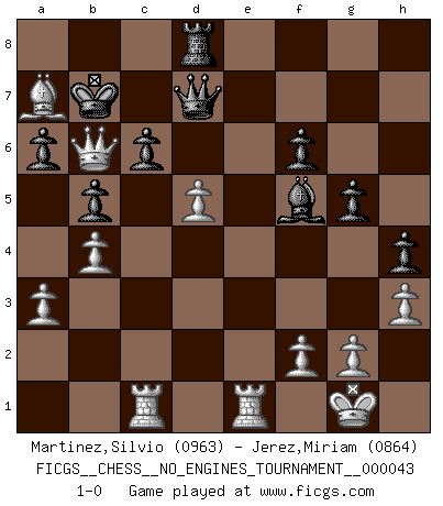 Last move : 1-0 2011 July 4 4:11:16 [Event "FICGS__CHESS__NO_ENGINES_TOURNAMENT__000043"] [Site "FICGS"] [Date "2011.06.25"] [Round "1"] [White "Martinez,Silvio"] [Black "Jerez,Miriam"] [Result "1-0"] [WhiteElo "0963"] [BlackElo "0864"] 1.e4 e5 2.Nf3 Nc6 3.Nc3 Nf6 4.d4 d5 5.exd5 Nxd5 6.Nxd5 Qxd5 7.Nxe5 f6 8.Bc4 Qd6 9.Nf7 Qe7+ 10.Be3 Rg8 11.Nd6+ Qxd6 12.Bxg8 Bf5 13.O-O O-O-O 14.c4 a6 15.c5 Qe7 16.Re1 Qd7 17.a3 Bd6 18.Bd5 g5 19.h3 h5 20.cxd6 Qxd6 21.Bxc6 Qxc6 22.b4 b5 23.d5 Qd7 24.Ba7 h4 25.Rc1 Kb7 26.Qd4 c6 27.Qb6+ 1-0 Four knights : Scotch variation Kingside Castling by player White (move 13) Queenside Castling by player Black (move 13) Player White won this chess game. Follow this game move after move (download)Fischer is an American Chess tragedy on par with Morphy and Pillsbury. (Mig Greengard) Je älter ich werde, um so mehr schätze ich die Bauern. (Paul Keres) Un buen jugador siempre tiene buena suerte. (José Raúl Capablanca) RxDa4 pat (...) The problem with manipulation is that people can turn on you. (Horatio Caine, C.S.I. Miami)