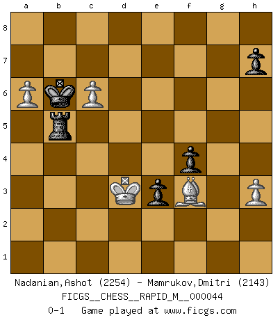 Last move : 0-1 2011 August 5 16:5:49 [Event "FICGS__CHESS__RAPID_M__000044"] [Site "FICGS"] [Date "2011.06.25"] [Round "1"] [White "Nadanian,Ashot"] [Black "Mamrukov,Dmitri"] [Result "0-1"] [WhiteElo "2254"] [BlackElo "2143"] 1.e4 c6 2.d3 d5 3.Nd2 e5 4.Ngf3 Bd6 5.Qe2 Nf6 6.g3 O-O 7.Bg2 Re8 8.O-O a5 9.Re1 Na6 10.Nf1 dxe4 11.dxe4 Nc5 12.Nh4 g6 13.Bg5 Ne6 14.Be3 a4 15.Rad1 Qc7 16.h3 b5 17.c3 Bf8 18.Nh2 Bd7 19.a3 Rad8 20.Nf5 gxf5 21.exf5 Ng7 22.Bg5 Be7 23.Bxf6 Bxf6 24.Ng4 Be7 25.Rxd7 Qxd7 26.f6 Bc5 27.Nh6+ Kf8 28.fxg7+ Kxg7 29.Qh5 Bxf2+ 30.Kxf2 Qd2+ 31.Re2 Qxh6 32.Qxh6+ Kxh6 33.Bxc6 Re6 34.Bxb5 Rf6+ 35.Ke1 Rf3 36.Bxa4 f6 37.Bc6 Rxg3 38.a4 Rg1+ 39.Kf2 Ra1 40.Kf3 Kg6 41.Ke4 Kf7 42.Bb5 R8d1 43.Rf2 Ke7 44.Rg2 Ke6 45.Bc4+ Kd6 46.Bb5 Rg1 47.Rd2+ Ke6 48.Bc4+ Ke7 49.b3 Rad1 50.Rxd1 Rxd1 51.a5 Kd6 52.a6 Kc6 53.Be6 Rc1 54.Kd3 Ra1 55.Bc8 Kc7 56.Bb7 f5 57.b4 e4+ 58.Kd4 Rd1+ 59.Kc5 Rd3 60.c4 e3 61.Bf3 Kb8 62.b5 Ka7 63.Kb4 Rd2 64.Kc3 Rf2 65.Bh5 f4 66.Kd3 Rd2+ 67.Kc3 Rh2 68.c5 Ra2 69.Kd3 Rb2 70.c6 Kb6 71.Bf3 Rxb5 0-1 Caro-Kann : Closed (Breyer) variation Kingside Castling by player Black (move 6) Kingside Castling by player White (move 8) 10 pieces endgame at move 71 : White KBPPP , Black KRPPP WHITE : King + 1 Bishop 3 Pawns BLACK : King + 1 Rook 3 Pawns Player Black won this chess game. Follow this game move after move (download)A passed Pawn increases in strength as the number of pieces on the board diminishes. (Capablanca) Dass jemand wie Surab Asmaiparaschwili, der selbst Elopunkte gekauft hat , Vize-Präsident der Fide werden konnte, sagt schon einges über den Zustand dieser Organisation aus. (Joel Lautier) Una de estas pequeñas movidas modestas pudieran ser mas molestas a tu oponente que la amenaza mas grande. (Siegbert Tarrasch) L'action d'une oeuvre littéraire se déroule sur un champ de bataille. Les masques et les types du drame moderne correspondent aux pièces du jeu d'échecs. L'intrigue correspond aux coups et aux gambits, c'est à dire aux techniques du jeu telles qu'utilisées et interprétées par les joueurs. Les tactiques et les péripéties [mouvements] correspondent aux coups exécutés par l'adversaire. (Viktor Shklovsky) Whenever people agree with me, I always feel I must be wrong. (Oscar Wilde)