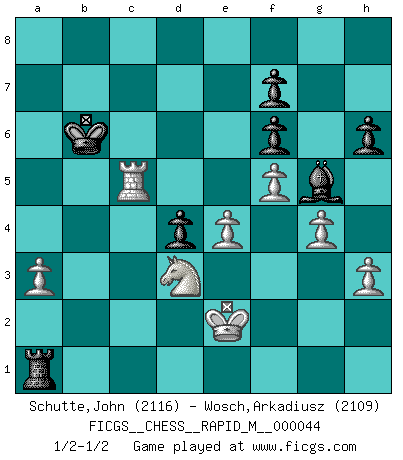 Last move : 1/2-1/2 2011 November 23 5:43:41 [Event "FICGS__CHESS__RAPID_M__000044"] [Site "FICGS"] [Date "2011.06.25"] [Round "1"] [White "Schutte,John"] [Black "Wosch,Arkadiusz"] [Result "1/2-1/2"] [WhiteElo "2116"] [BlackElo "2109"] 1.e4 c5 2.Nf3 Nc6 3.d4 cxd4 4.Nxd4 Nf6 5.Nc3 d6 6.Bg5 e6 7.Qd2 a6 8.O-O-O Bd7 9.f4 b5 10.Bxf6 gxf6 11.Kb1 Qb6 12.Nxc6 Bxc6 13.f5 b4 14.Ne2 e5 15.Ng3 Qc5 16.Bd3 a5 17.Nh5 Be7 18.Qe2 Rg8 19.Bc4 a4 20.h3 Rc8 21.b3 Rg5 22.g4 Rg8 23.Rhg1 h6 24.Rg3 Rf8 25.Qe1 Kd7 26.Re3 Rc7 27.Qd2 Kc8 28.Ng3 Kb8 29.Rd3 Bb7 30.Qg2 Qb6 31.Nf1 axb3 32.cxb3 d5 33.Bxd5 Ba6 34.Bc4 Bxc4 35.bxc4 Bc5 36.Rd8+ Kb7 37.Qf3 Rxd8 38.Rxd8 Be7 39.Rd3 Rxc4 40.Ne3 Rc6 41.Qd1 Qc5 42.Rb3 Bd6 43.a3 Qd4 44.Qxd4 exd4 45.Nc2 Rc4 46.Nxb4 Kb6 47.Nc2 Ka5 48.Rd3 Be5 49.Kc1 Kb5 50.Rb3+ Kc5 51.Kd1 Bf4 52.Ne1 Rc1+ 53.Ke2 Kc4 54.Rb6 Ra1 55.Nd3 Bg5 56.Rc6+ Kb5 57.Rc5+ Kb6 1/2-1/2 Sicilian defense Queenside Castling by player White (move 8) This chess game ended in a draw. Follow this game move after move (download)Adequate compensation for a sacrifice is having a sound combination leading to a winning position; adequate compensation for a blunder is having your opponent snatch defeat from the jaws of victory. (Bruce A. Moon) Ich kenne keine einzige Person, die behaupten würde, Garri Kasparow sei ein guter Mensch (Nigel Short) Después de la respuesta de las negras a 1.e4 con 1..e5, se quedan siempre tratando de entrar dentro del juego. (Howard Staunton) Vous n'êtes pas toujours obligé de jouer le meilleur coup. Un coup doit être actif, entreprenant, correct et beau ! (David Bronstein) If you know the enemy and know yourself you need not fear the results of a hundred battles. (Sun Tzu)